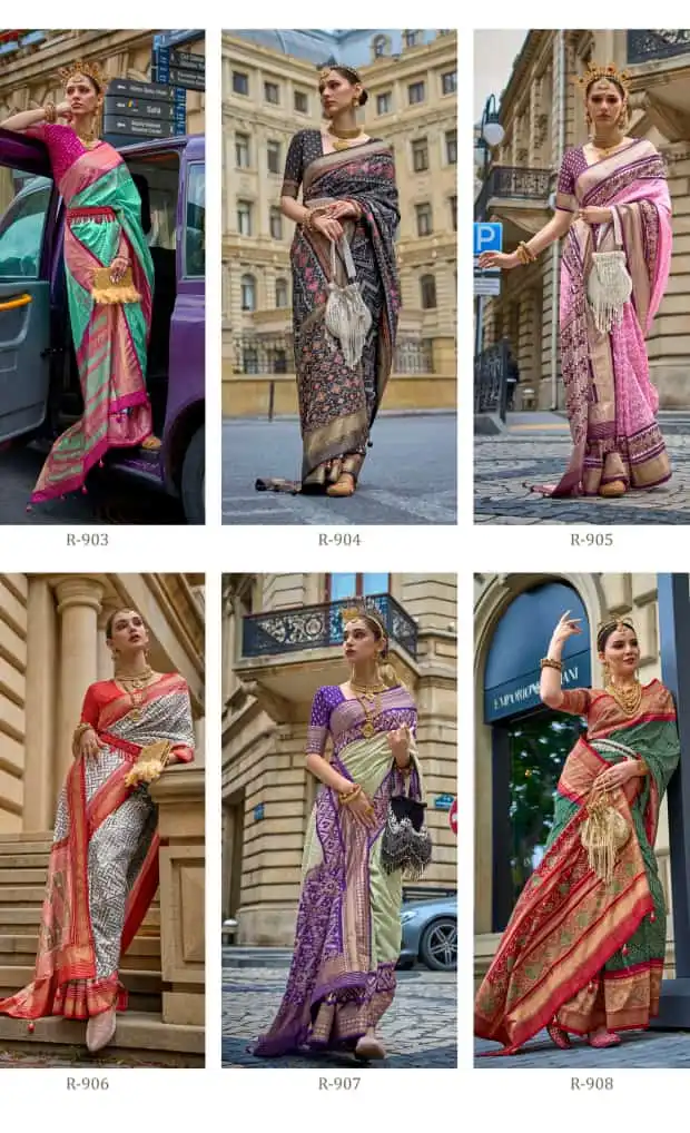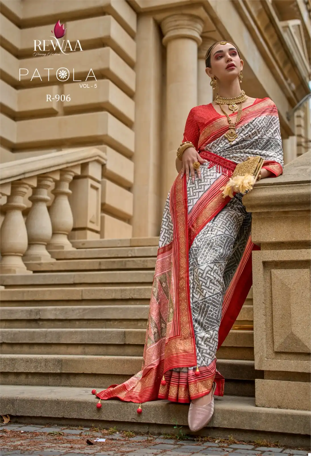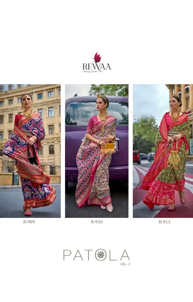 Rewaa Patola Vol 5 Super 801 P.V Silk Wholesale Saree Catalog of 9 Pcs. We deal in Kurtis, Sarees, Dresses Materials, Leggings, and Designer Salwar Kameez.