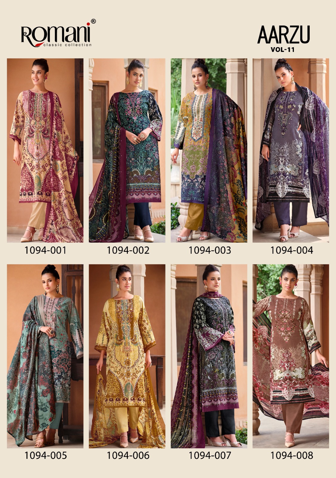 Introducing Romani Aarzu Vol 11, a collection of elegant and breathable soft cotton suits featuring digital-style prints and intricate embroidery work. Designed for comfort and style, this set is perfect for daily wear, office wear, or festive occasions.