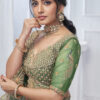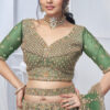 Ideal for Mehendi or festive functions, this green lehenga exudes regal charm. Pair it with statement jewelry, such as gold or kundan pieces, to elevate its beauty. A soft bun or loose waves with fresh flowers will complement the look, while the waist belt and latkan provide a modern touch to the traditional ensemble. This lehenga ensures you make a striking impression at any celebration.
