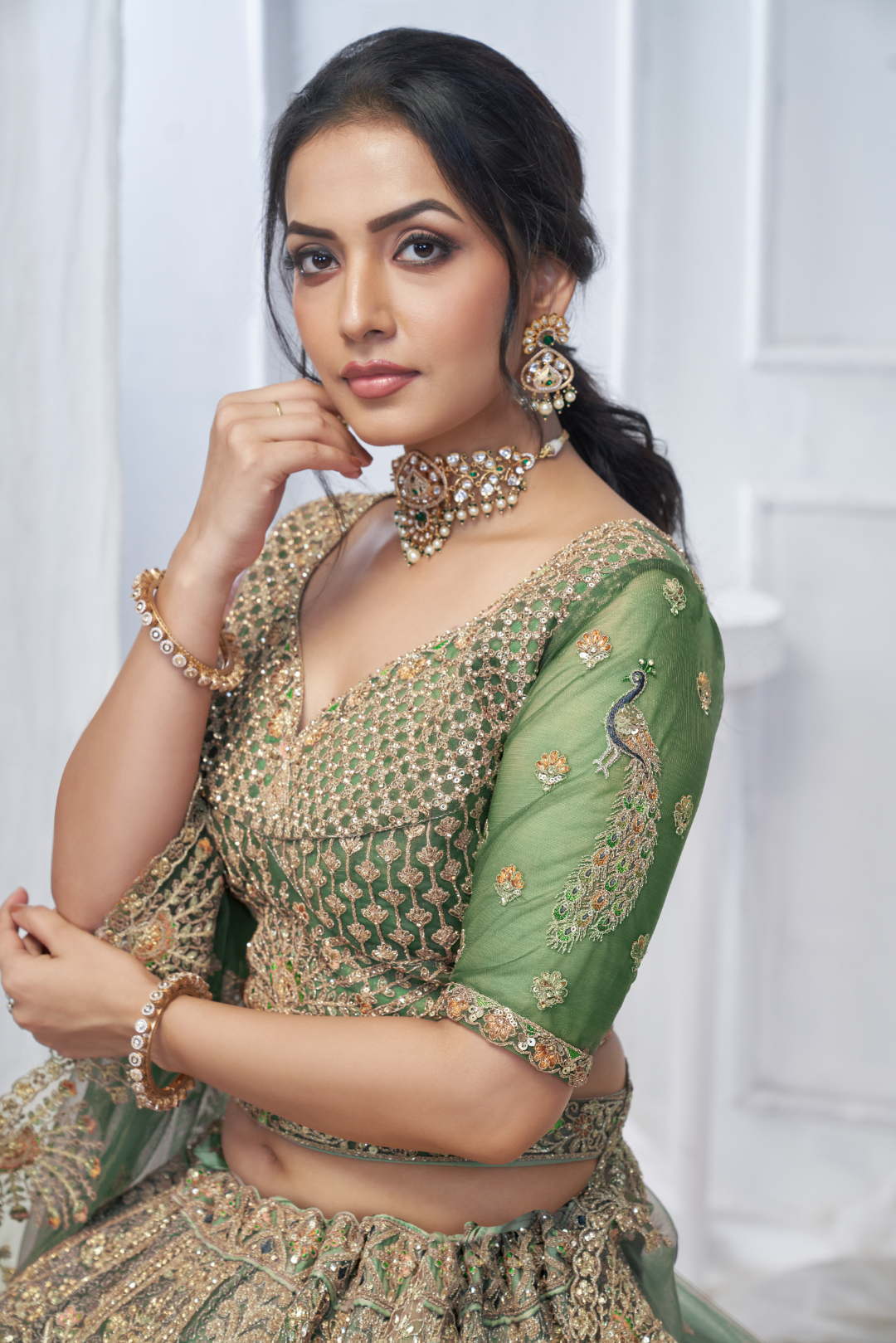 Royal Grandeur Green Mehendi Bridal Lehenga with Paisley & Peacock Motifs