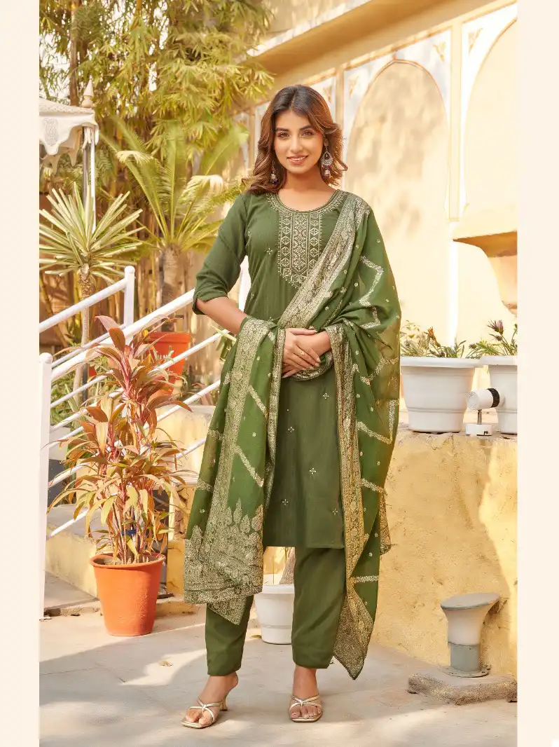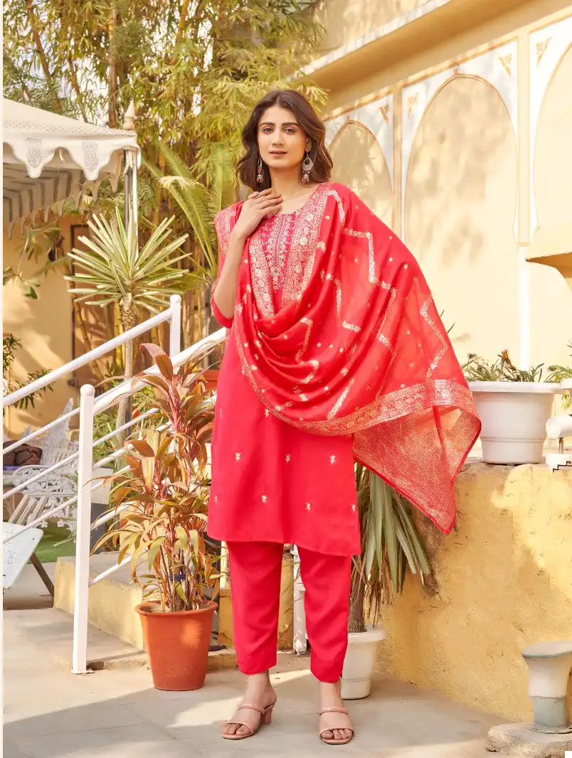 - Dupatta: The set is complemented by a Heavy Silk Banarasi Dupatta, which adds a luxurious touch to your attire. The Banarasi Dupatta features exquisite detailing and intricate patterns, enhancing the overall elegance of the ensemble.