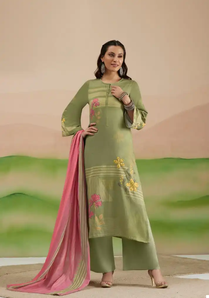 - Top: The Cotton Satin top boasts a captivating print enhanced with intricate handwork, adding a touch of sophistication to your ensemble. The meticulous detailing elevates the overall appeal, making it suitable for various occasions.