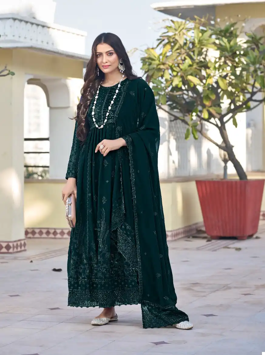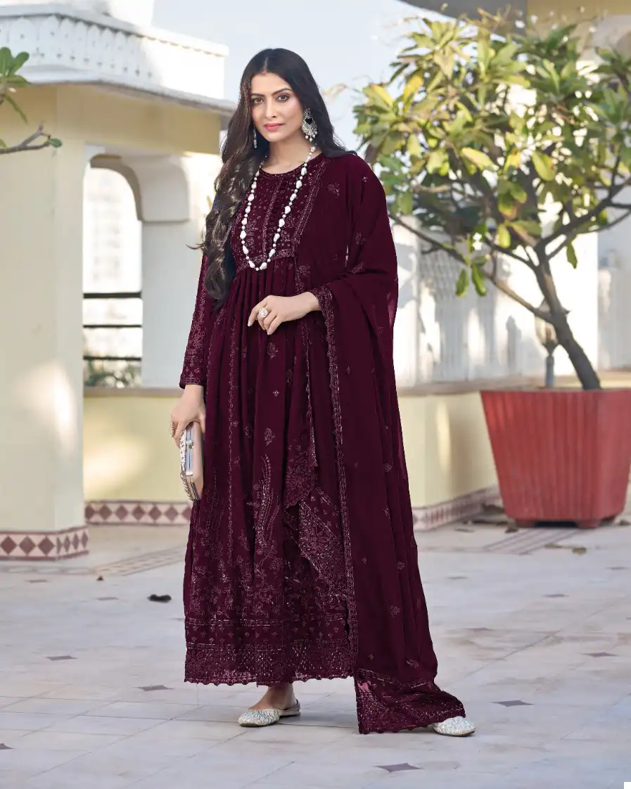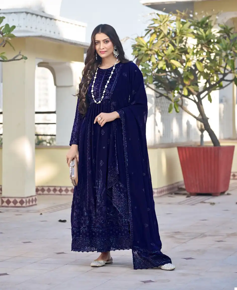 - Dupatta: Georgette – Describes the fabric of the accompanying scarf or dupatta.