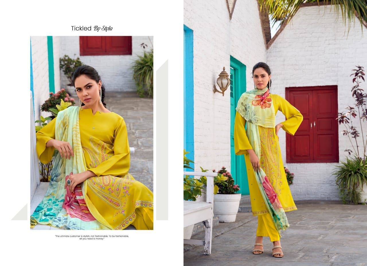 - Dupatta: Viscose Brazilian chiffon with digital print and tassels, adding a touch of luxury