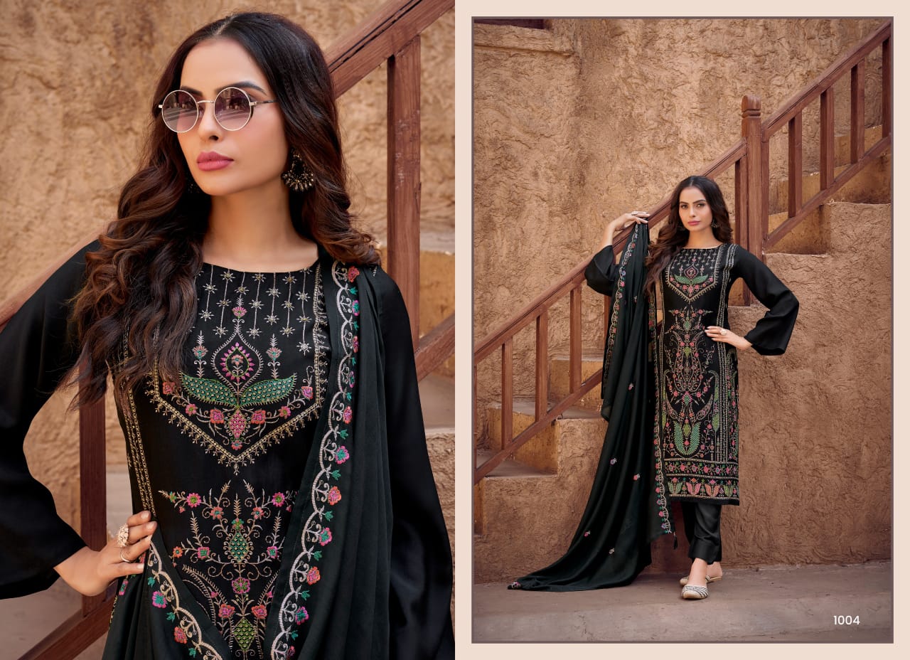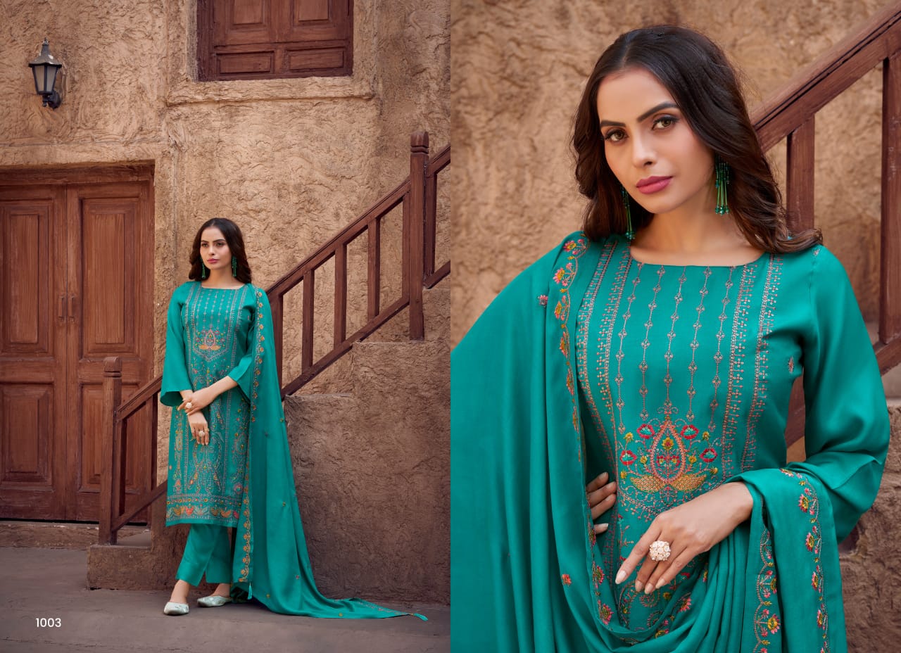Step into elegance with KAINAT, a 4-piece collection featuring rich viscose bember maslin fabric with exquisite heavy embroidery. Perfect for festive and grand occasions!