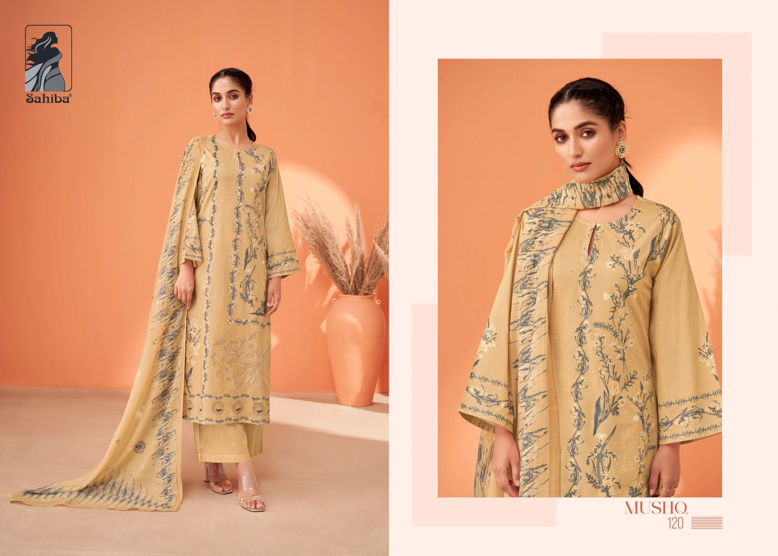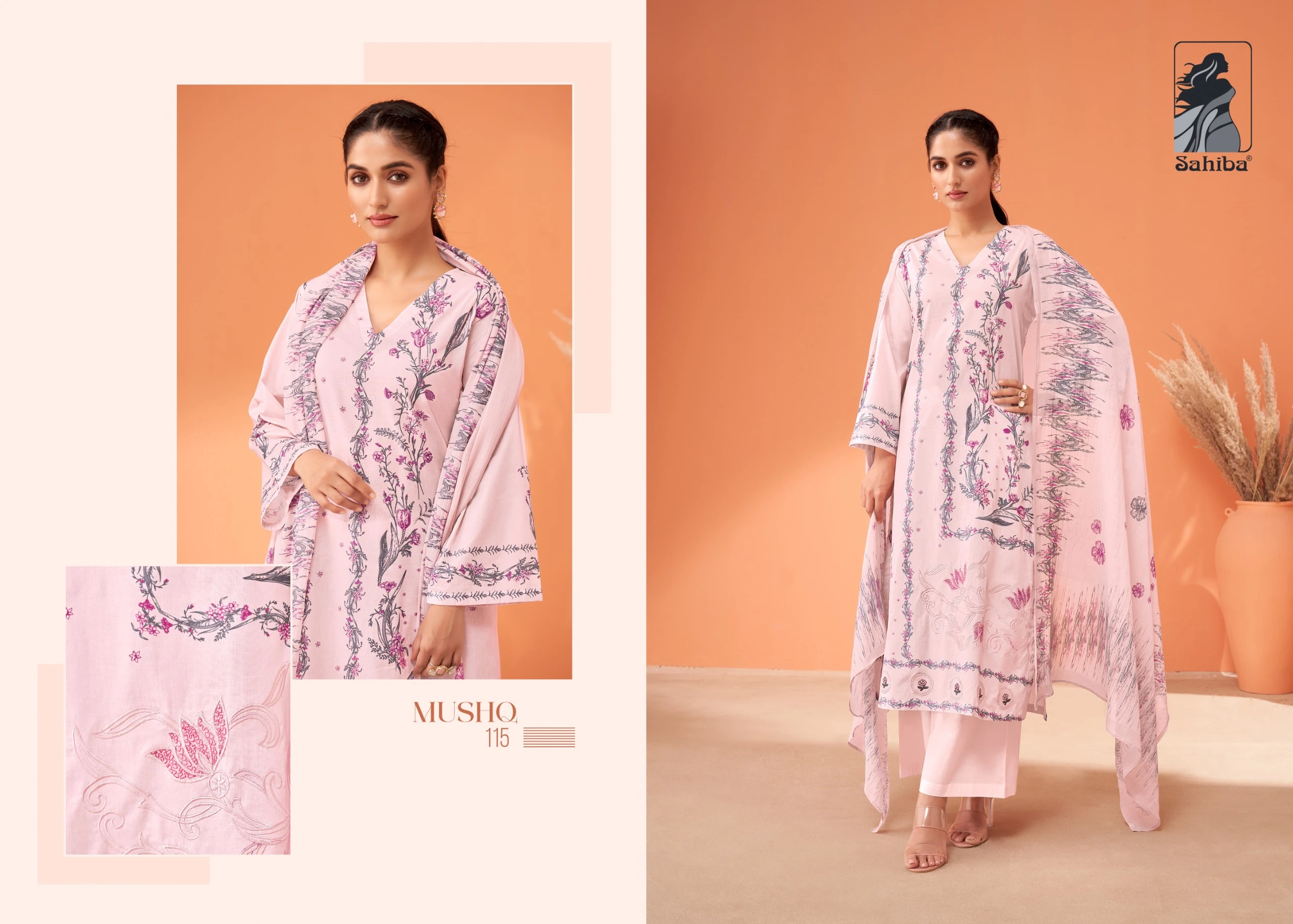 - Design: Digital print with embroidery and hand work, including threadle work