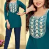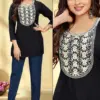 - Top: Made of Viscose Fancy Rayon fabric with white embroidery and moti work.