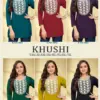 - Each top features white embroidery and moti work, adding embellishments and decorative elements.