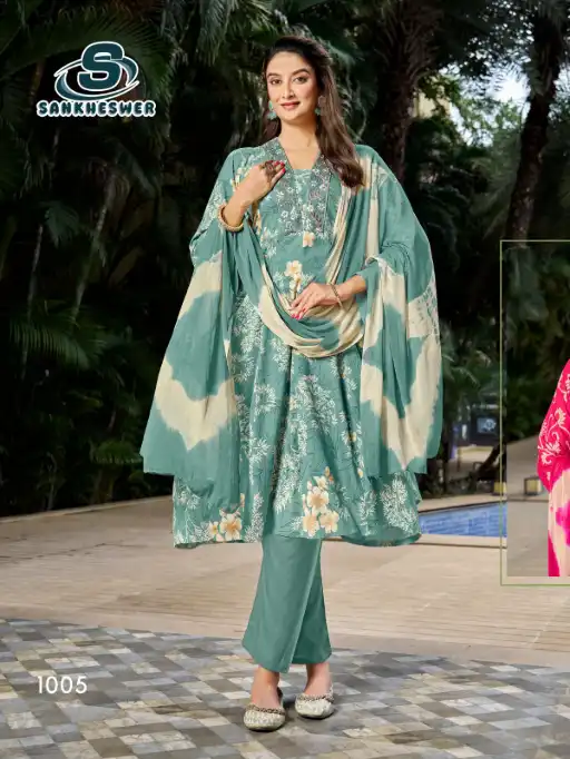 Buy Sankheswer Impex Affeirs Vol-1 Anarkali rayon suit collection at wholesale rate.