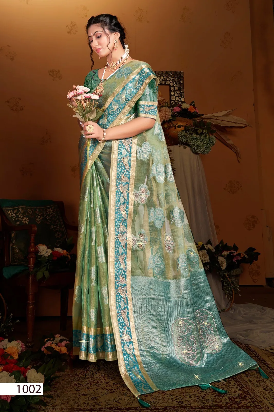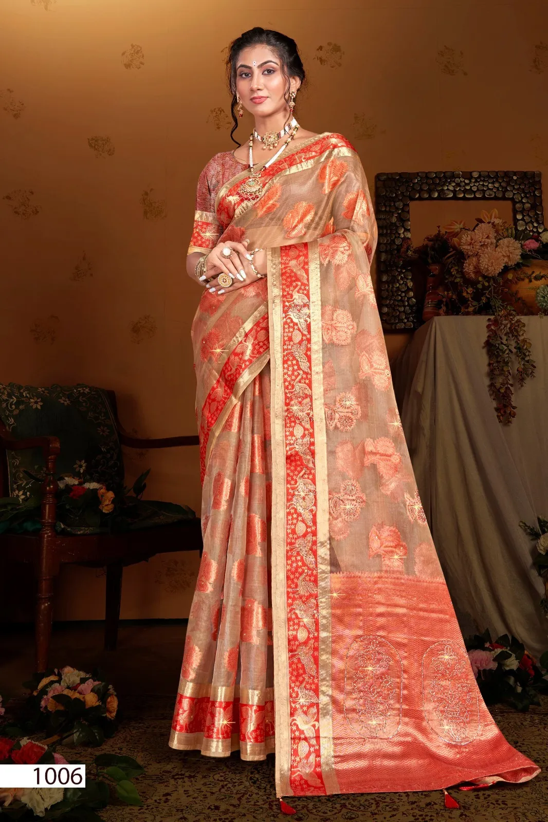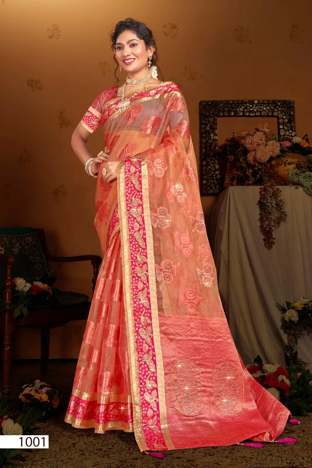 | Saree | Fancy Tissue Organja With Swarovski Work |