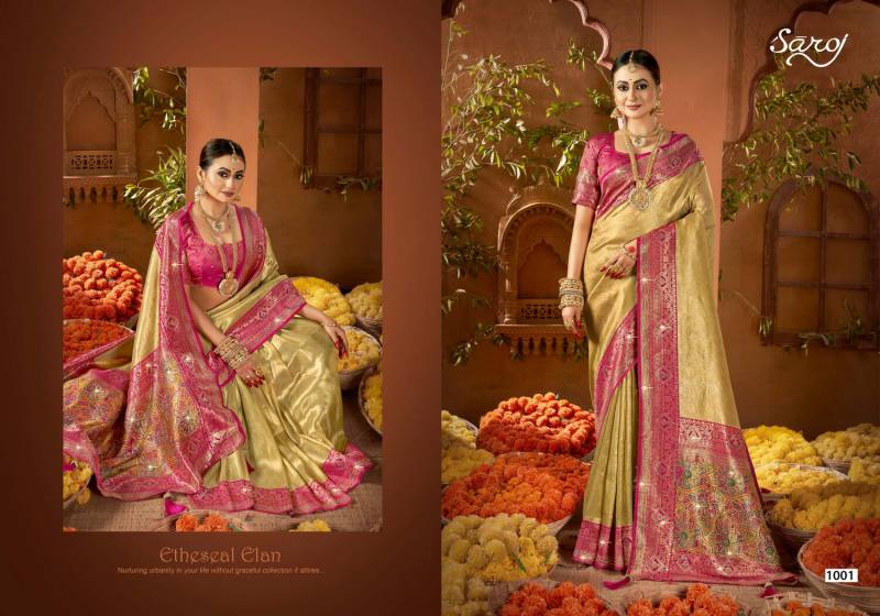 Shop Saroj Sanskaar Silk Saroski Vol 5 – Premium Paithani Soft Satin Tissue Sarees with Mina Pallu at ₹1925 + GST. 6 luxurious designs now available at wholesale price.