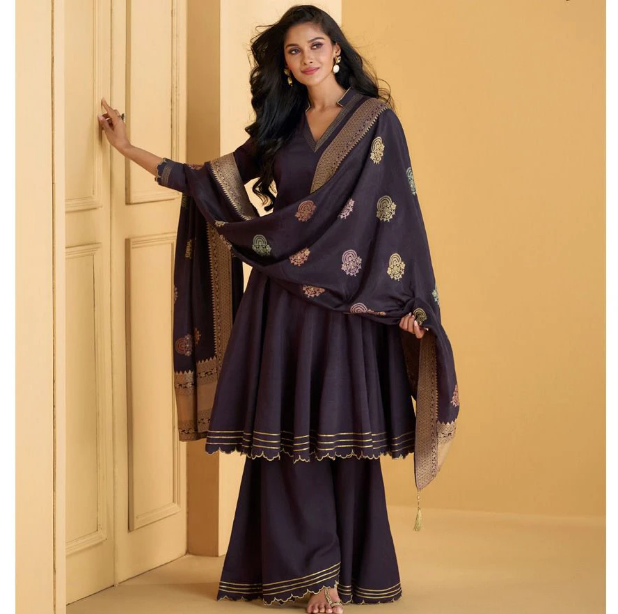 The set is available in a free size, stitched to fit various body types comfortably. Offered as a complete unit, this set provides a coordinated and sophisticated ensemble suitable for special occasions.