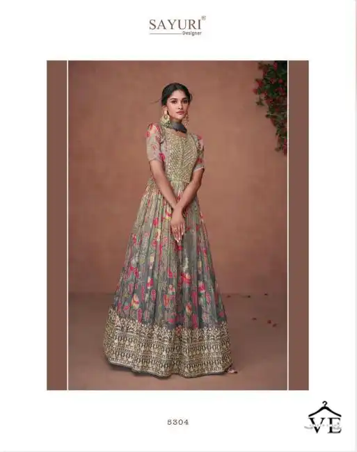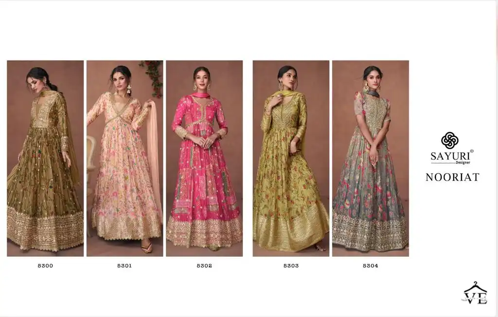 Sayuri Designer Nooriat Organza Wholesale Designer Long Party Wear Gown With Dupatta Catalog 5 Pcs. We deal in Kurtis, Sarees, Dresses Materials, Leggings, and Designer Salwar Kameez.