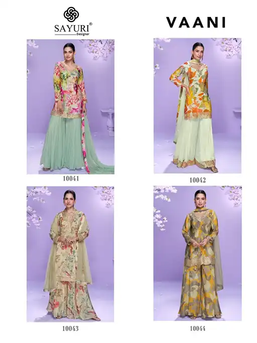 Shop Sayuri Designer’s latest Vaani collection featuring 4 exclusive suits crafted in real premium Chinon Silk at ₹1999 + 12% GST.