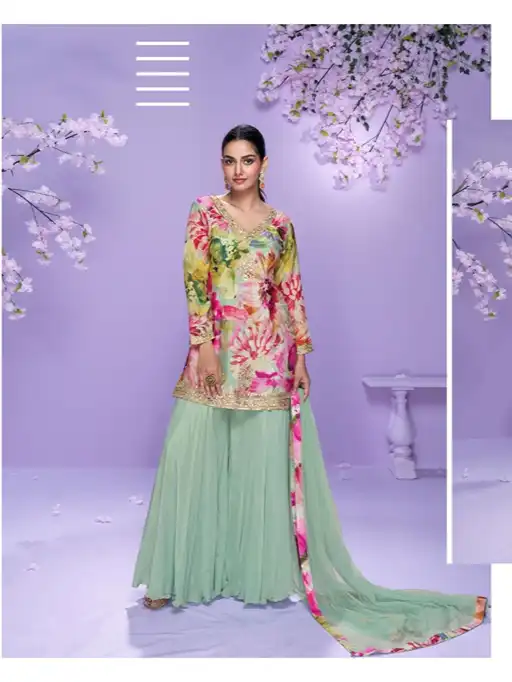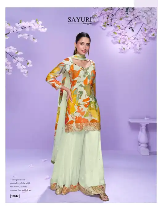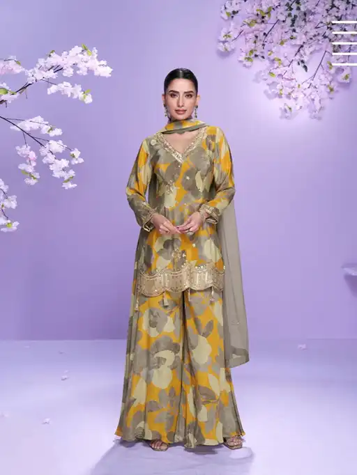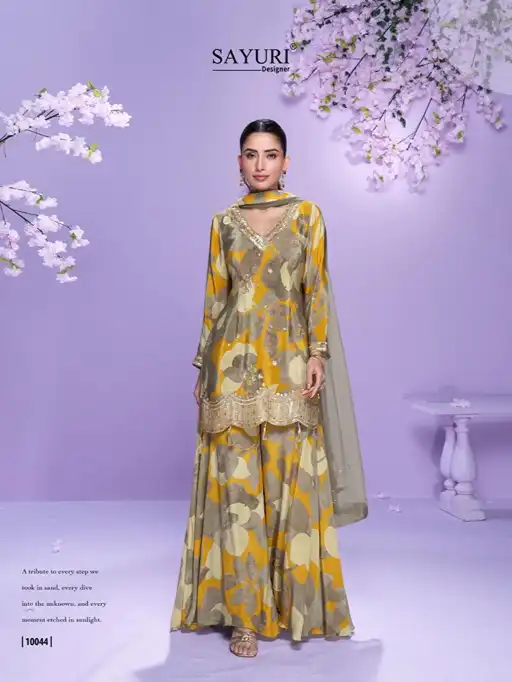 Sayuri Designer Vaani Wholesale Premium Chinon Silk Readymade Sharara Suit.
