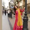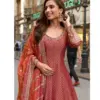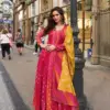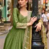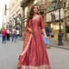 - Elevate your festive wardrobe with the Sayuri Kusum Designer Gown Collection, crafted in premium viscose jacquard silk for a rich and elegant appeal. This stunning gown features intricate front and back embroidery work, giving it a graceful designer finish. Paired with a beautifully coordinated Chinon silk dupatta enhanced with digital print and embroidery, this set is perfect for festive gatherings and special occasions.