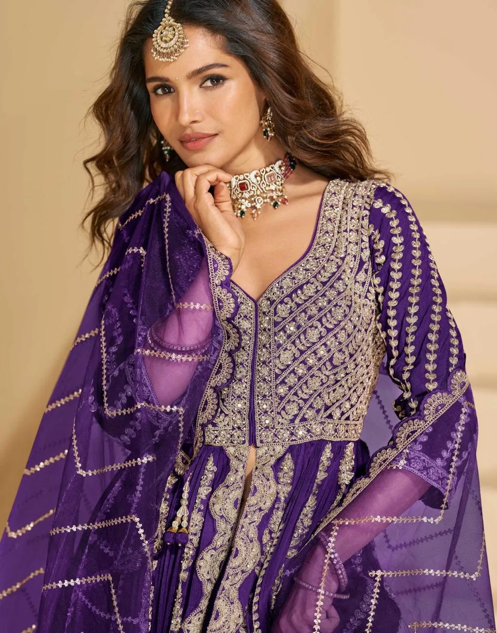 | Dupatta | Premium Real Chinon Silk Front Cut Floor Length Top Skirt And Embroidred |