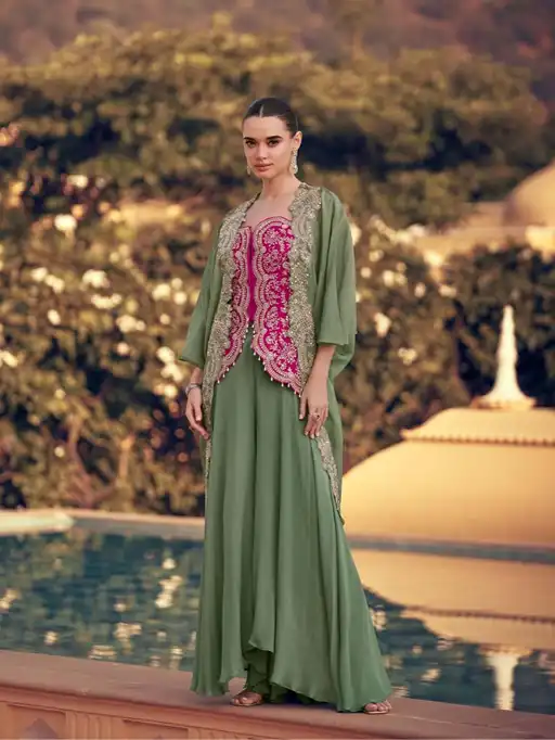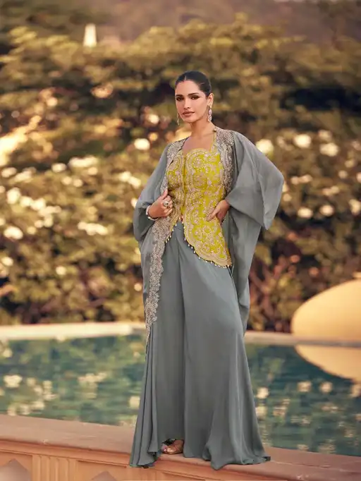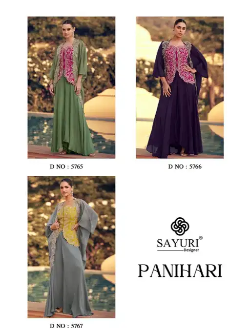 Buy Sayuri Panihari 5765 premium coord set with hand-embellished work & organza jacket. Designer stitched sets available at Vardan Ethnic. (145 characters)