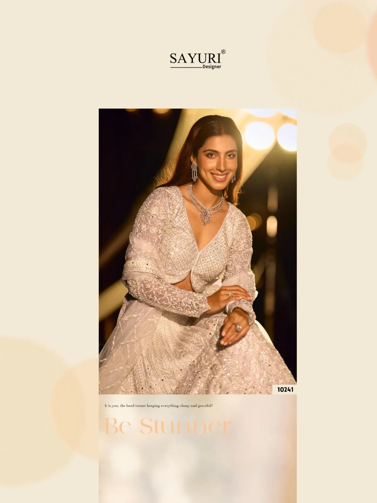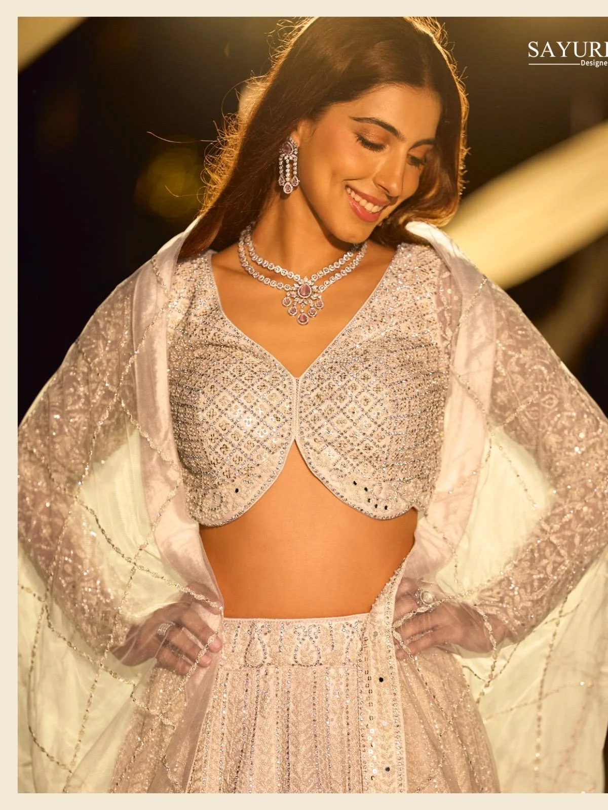 - The SAYURI DESIGNER RIYAASAT Collection is a luxurious 6-piece premium designer range crafted from Pure Net with full heavy embroidery and intricate handwork. This exclusive collection comes with hand-applied pearls, beads, mirror work, and Seroski diamond embellishments, making it perfect for bridal functions and high-end fashion clients.
