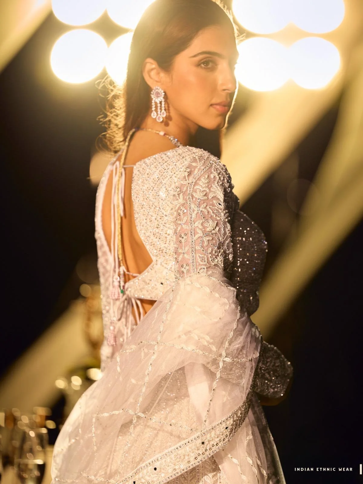 - The lehenga is designed with front and back heavy work, paired with rich finishing and a structured cancan flare to enhance its bridal silhouette. The elegant off-white shade adds sophistication and timeless beauty, making it ideal for engagements, receptions, pre-wedding shoots, sangeet nights, and luxury bridal occasions.