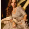 - The lehenga is designed with front and back heavy work, paired with rich finishing and a structured cancan flare to enhance its bridal silhouette. The elegant off-white shade adds sophistication and timeless beauty, making it ideal for engagements, receptions, pre-wedding shoots, sangeet nights, and luxury bridal occasions.