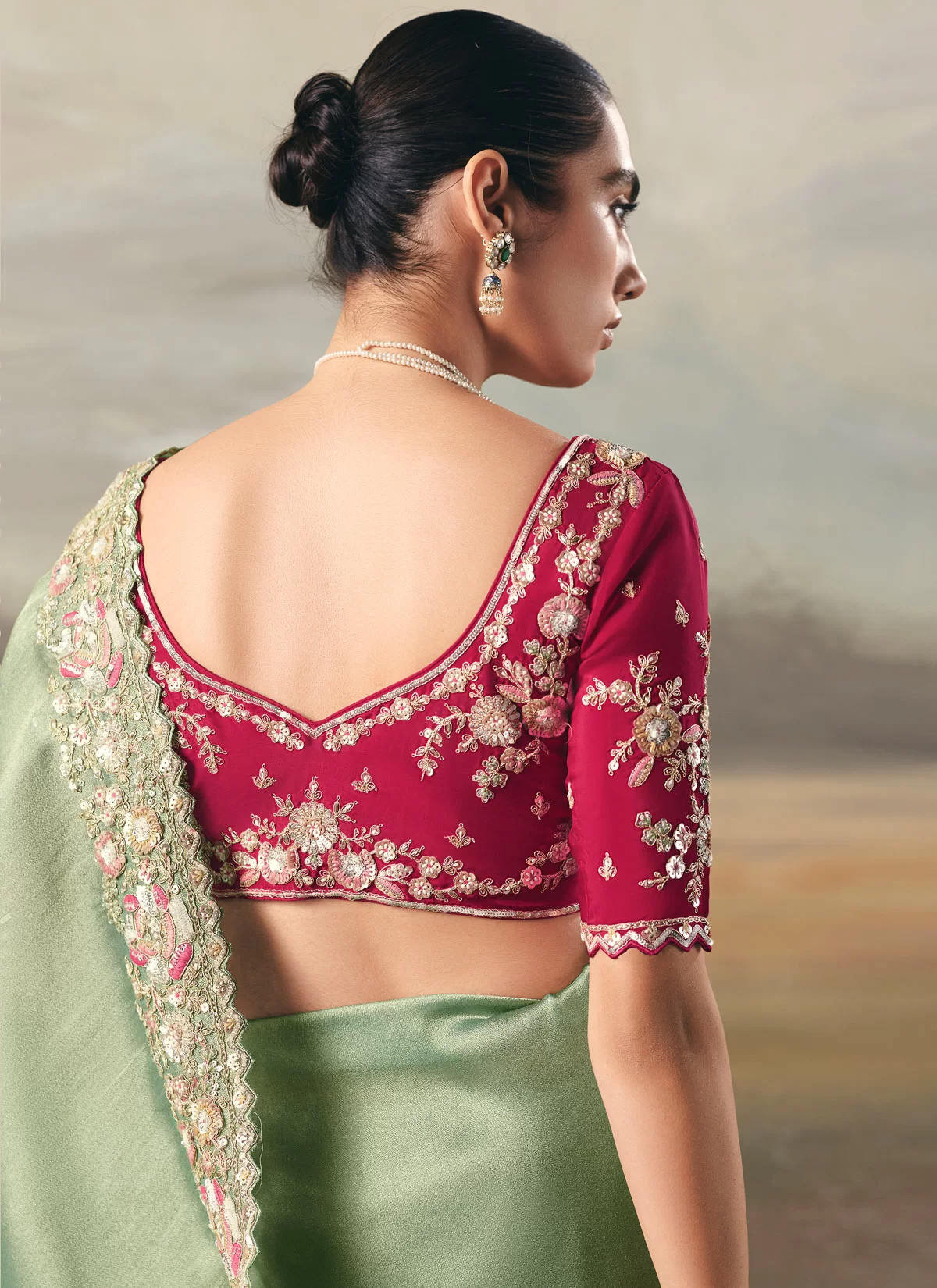Sea Green Tissue Silk Saree with Heavy Embroidered Border & Blouse