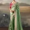 - Elevate your festive elegance with this luxurious sea green tissue silk saree, designed for timeless sophistication. The saree features a soft, luminous tissue silk base enhanced with a richly embroidered border and pallu, showcasing intricate floral motifs crafted with fine threadwork and embellishments.