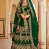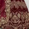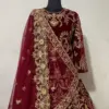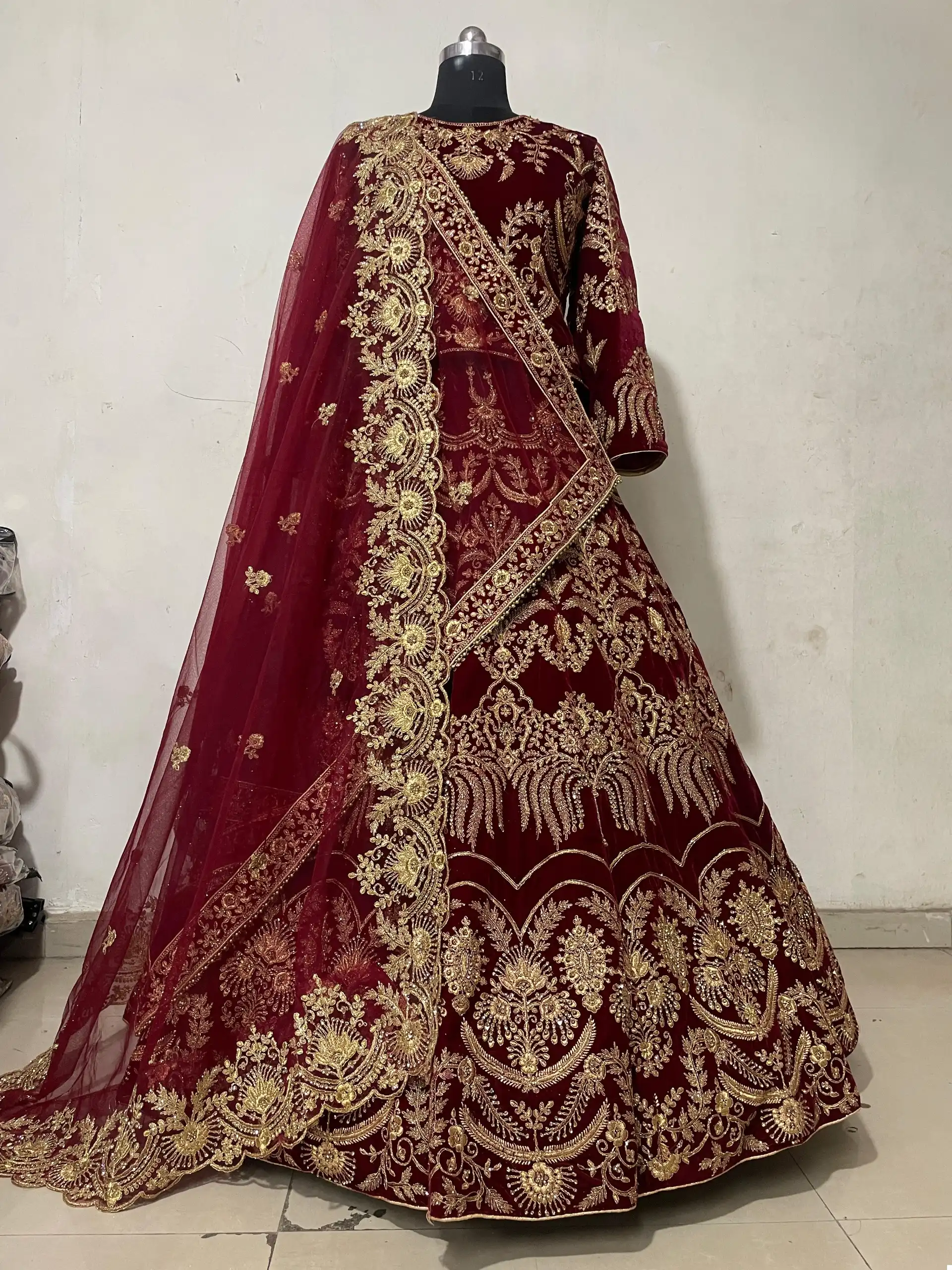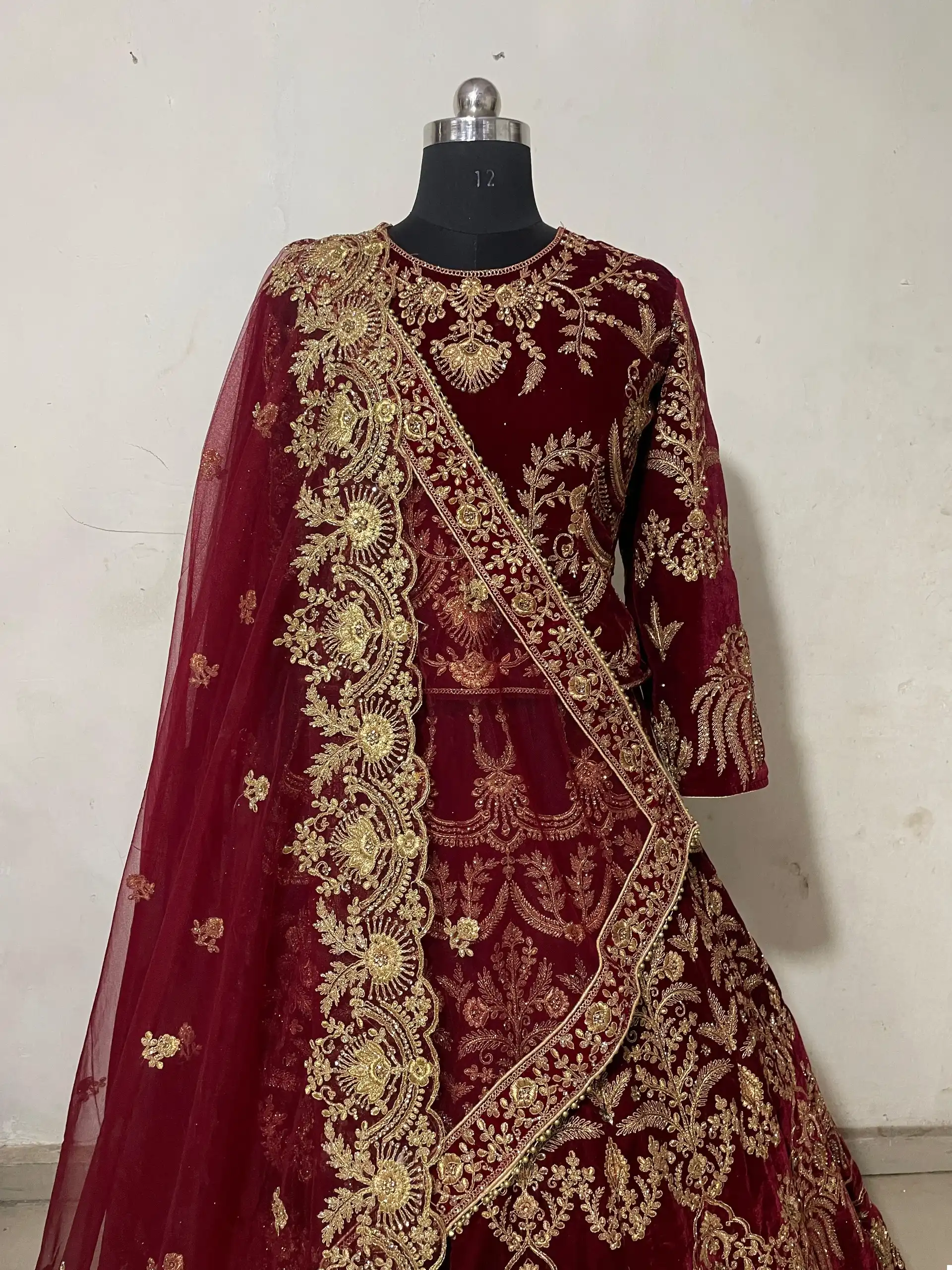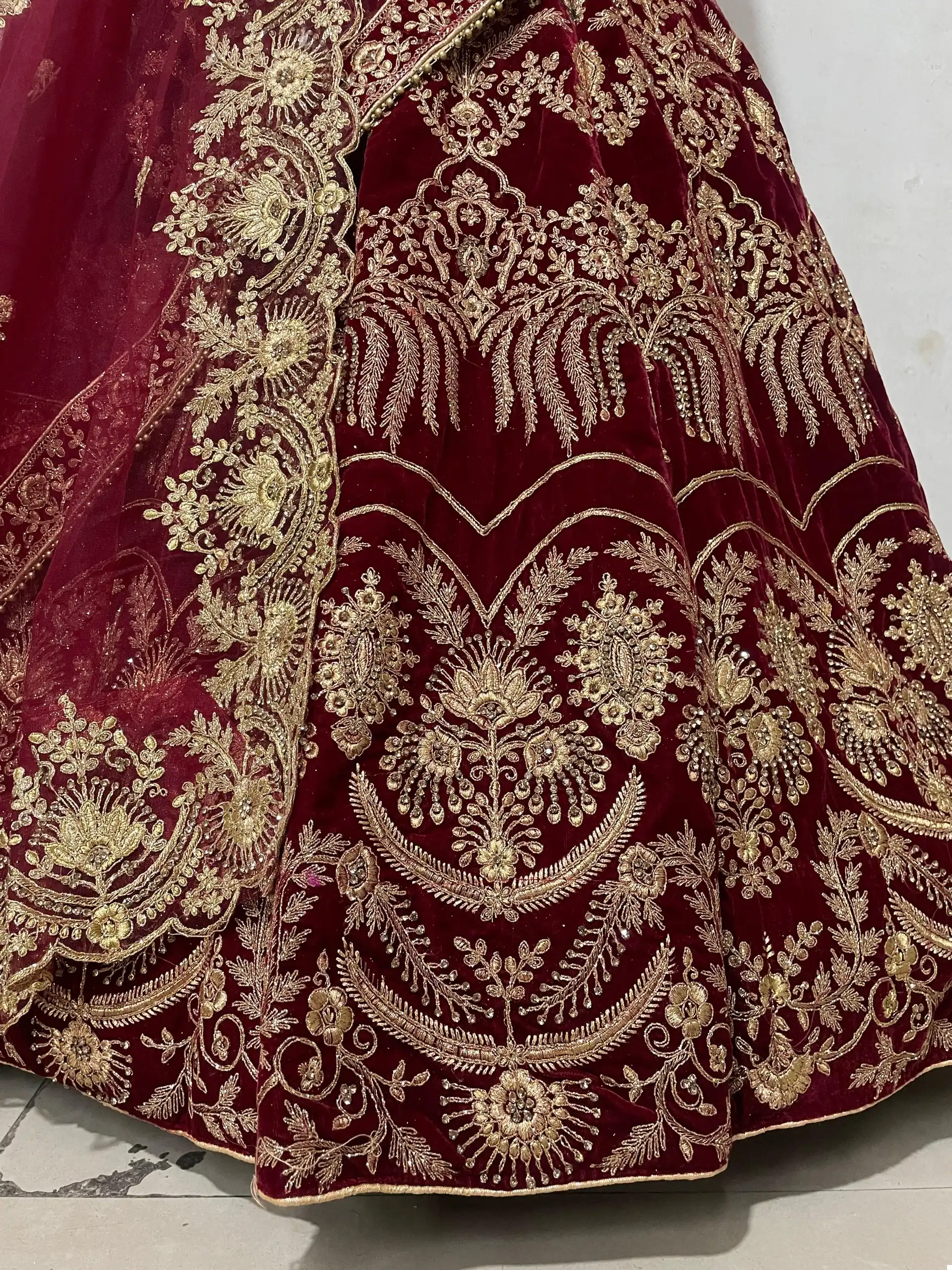 - The lehenga is crafted from 9000 Heavy Velvet fabric and features Fancy Dori Work and Zarkan Work, adding intricate detailing and embellishments.