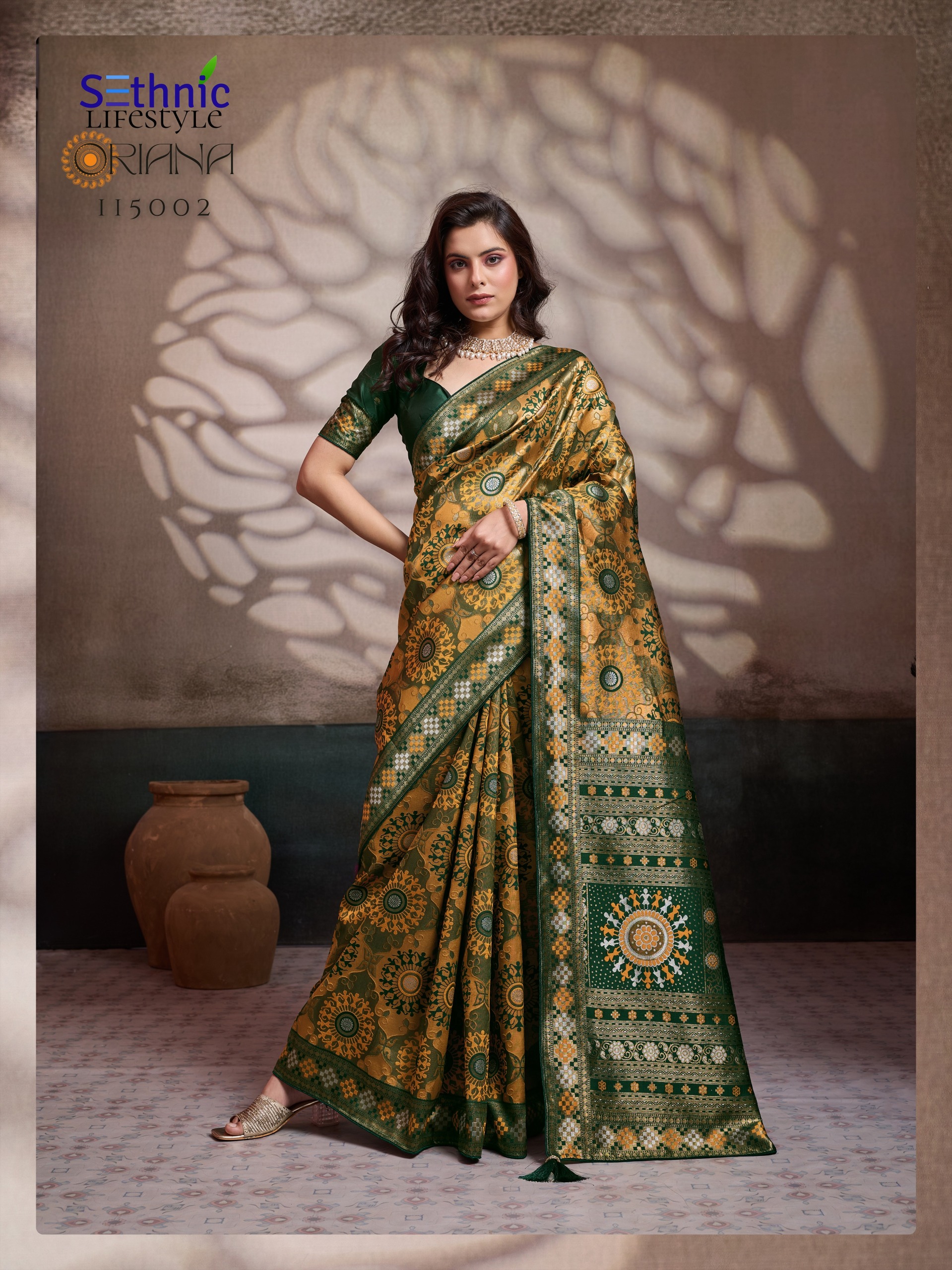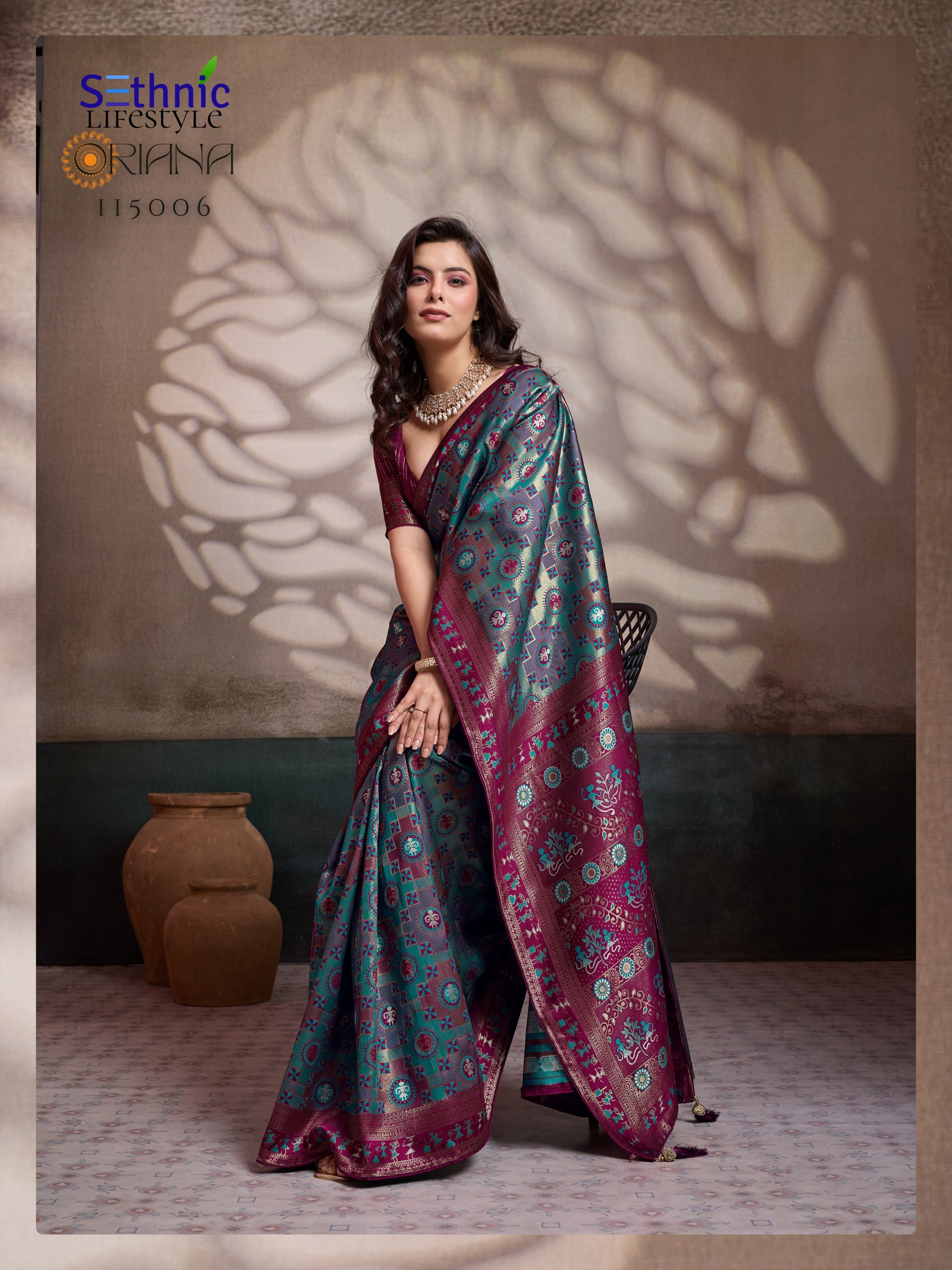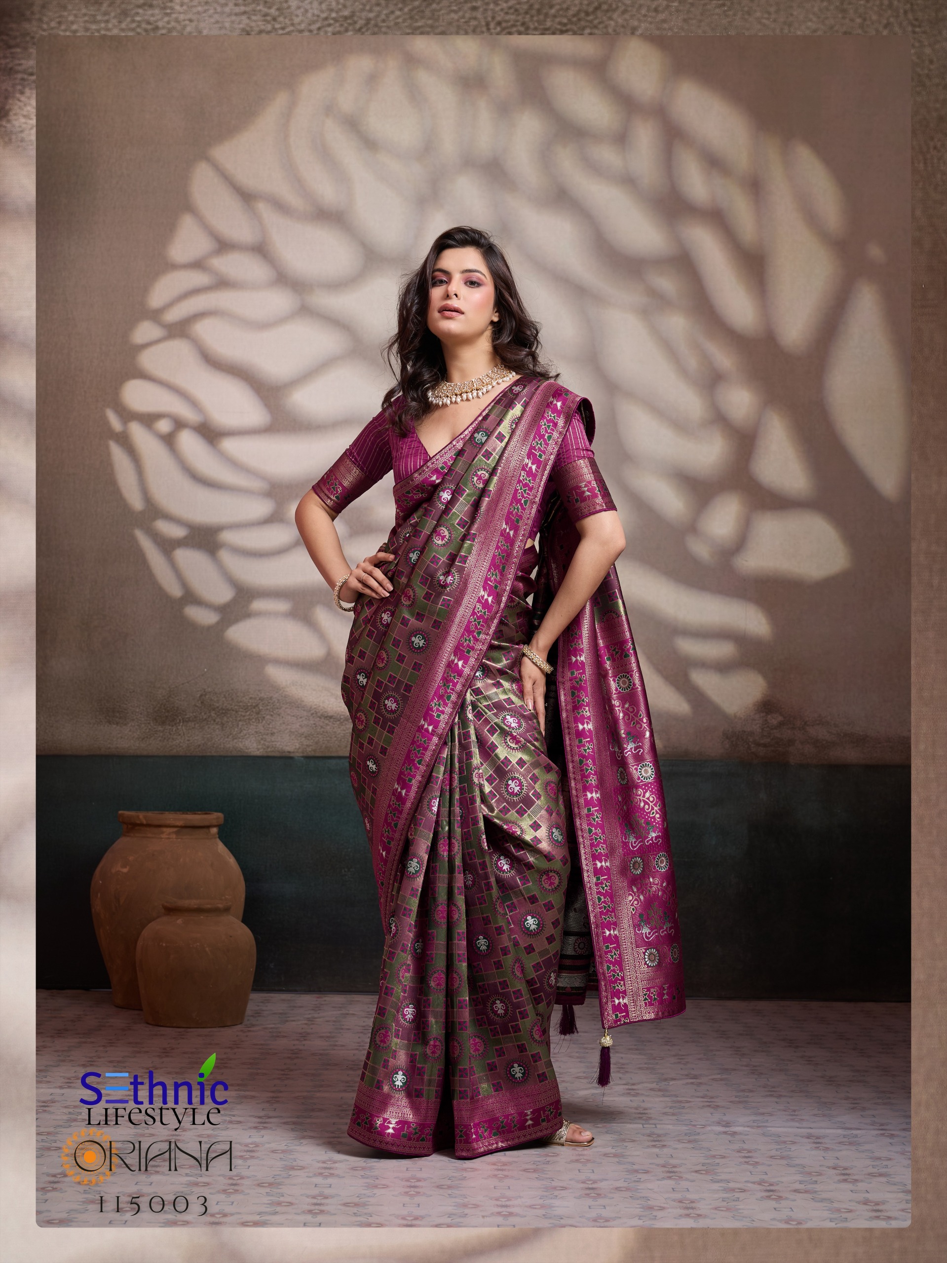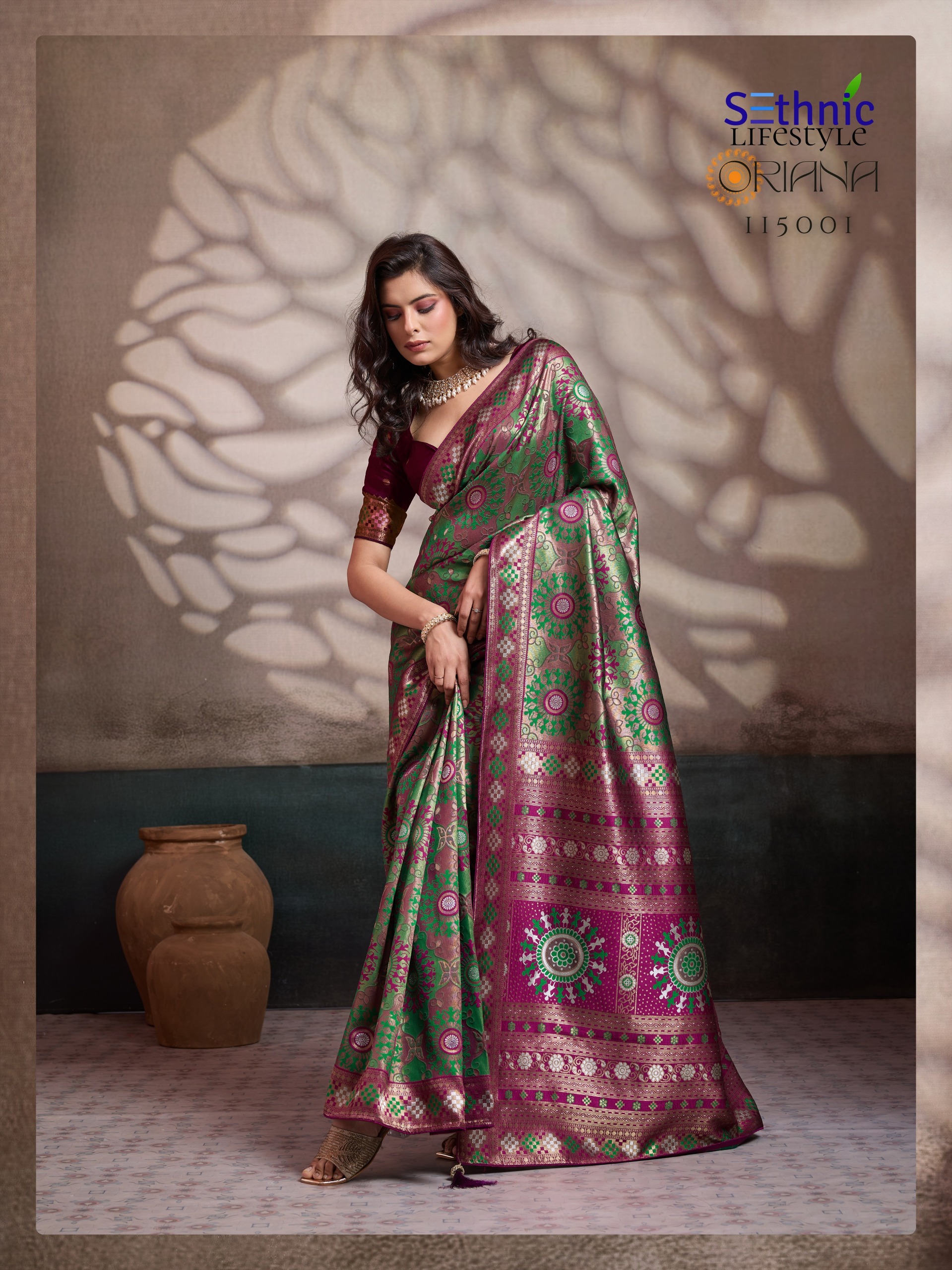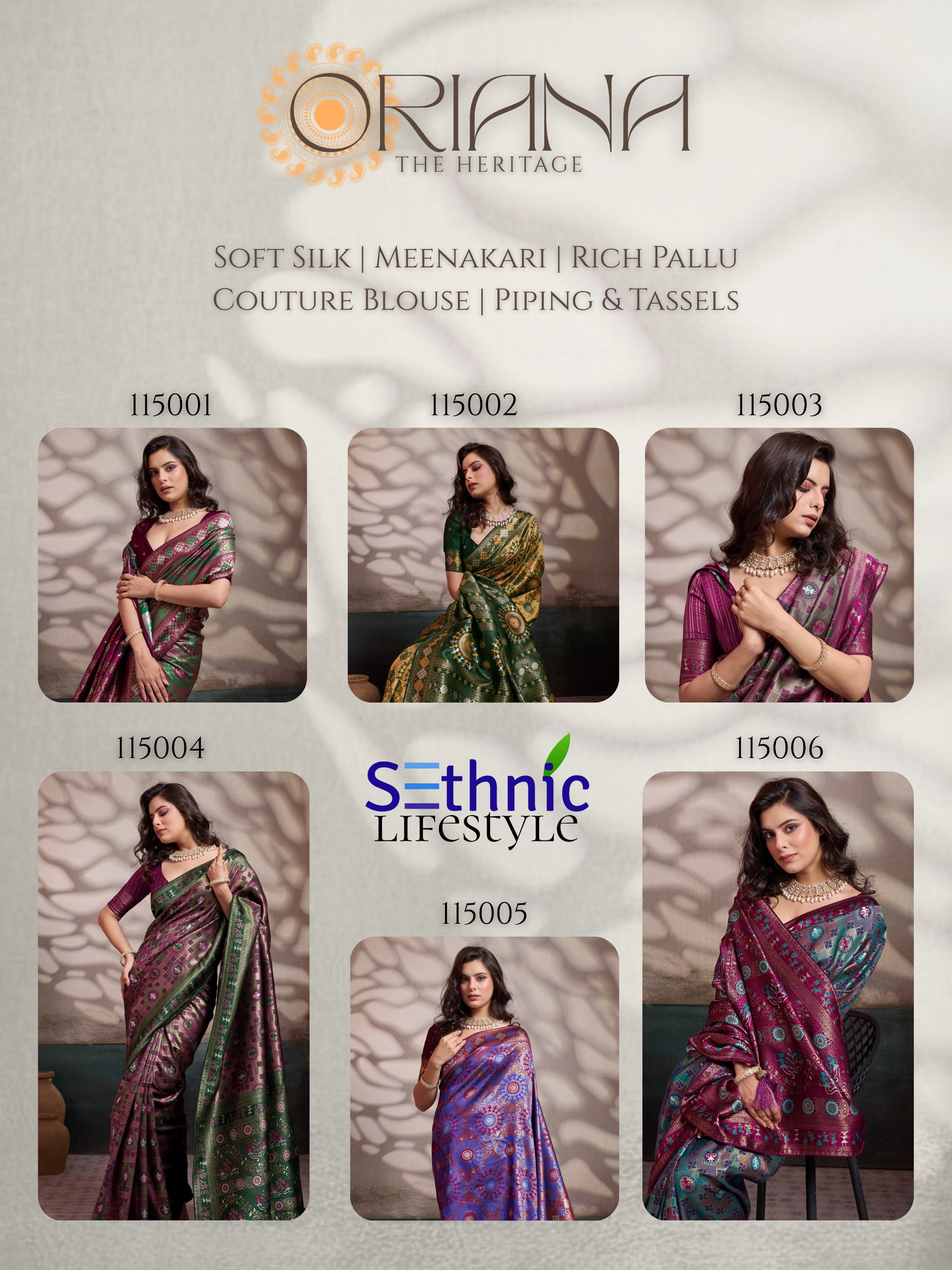 - The Sethnic Oriana Saree Collection is a perfect celebration of Indian heritage and timeless elegance. Crafted in luxurious soft silk fabric, each saree is beautifully enhanced with zari meenakari woven work, reflecting classic artistry and traditional charm.