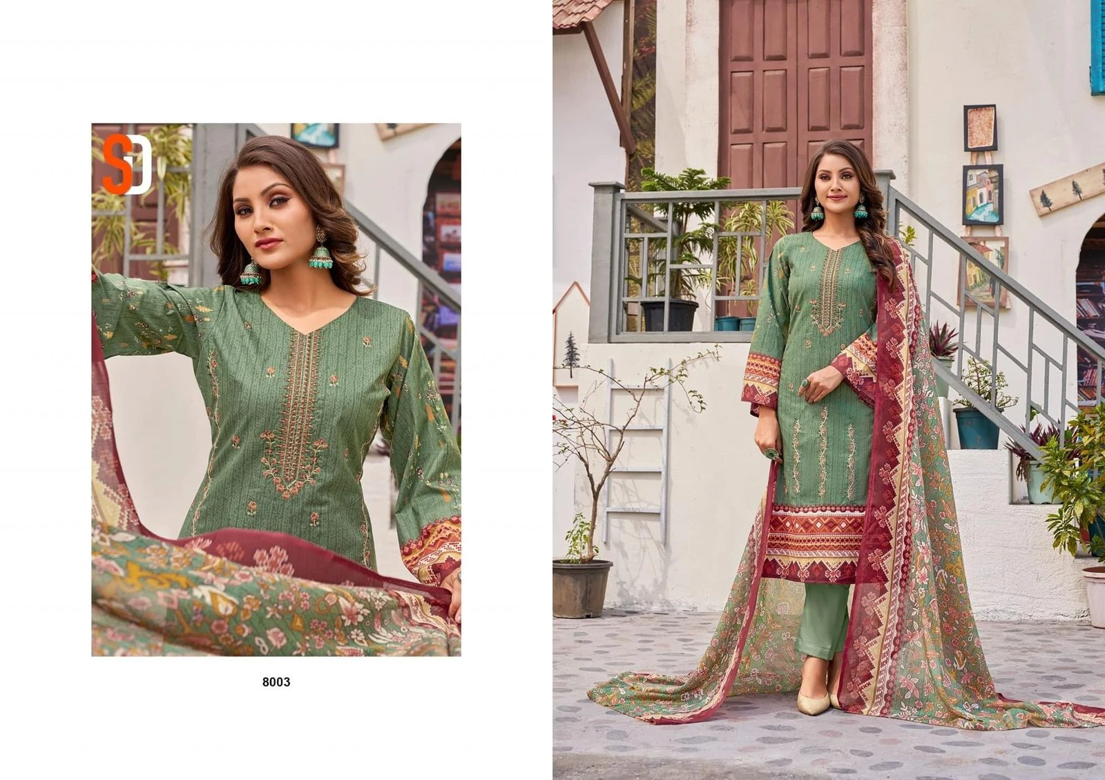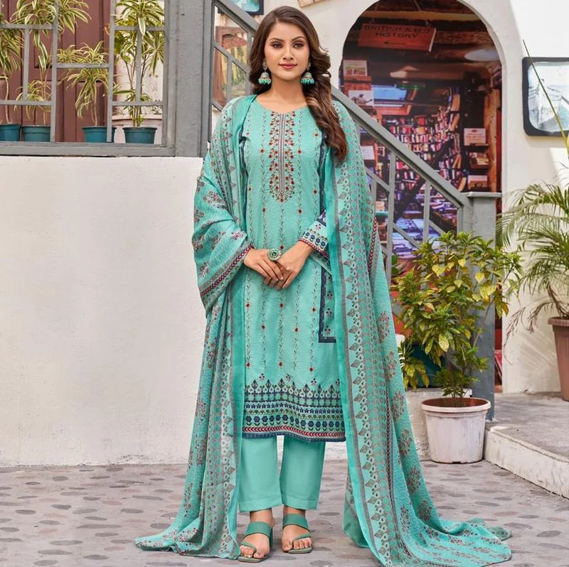 This set features a pure cotton top with self-embroidery, cotton solid bottom, and a cotton mal-mal dupatta. Each piece is priced at ₹650 and is available in a set of 6, with all pieces needing to be purchased together.