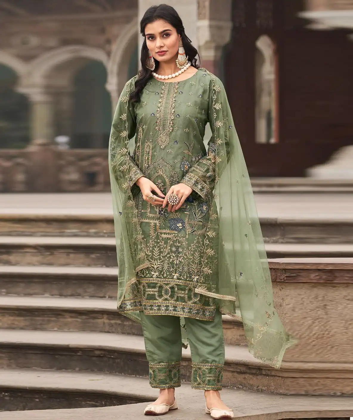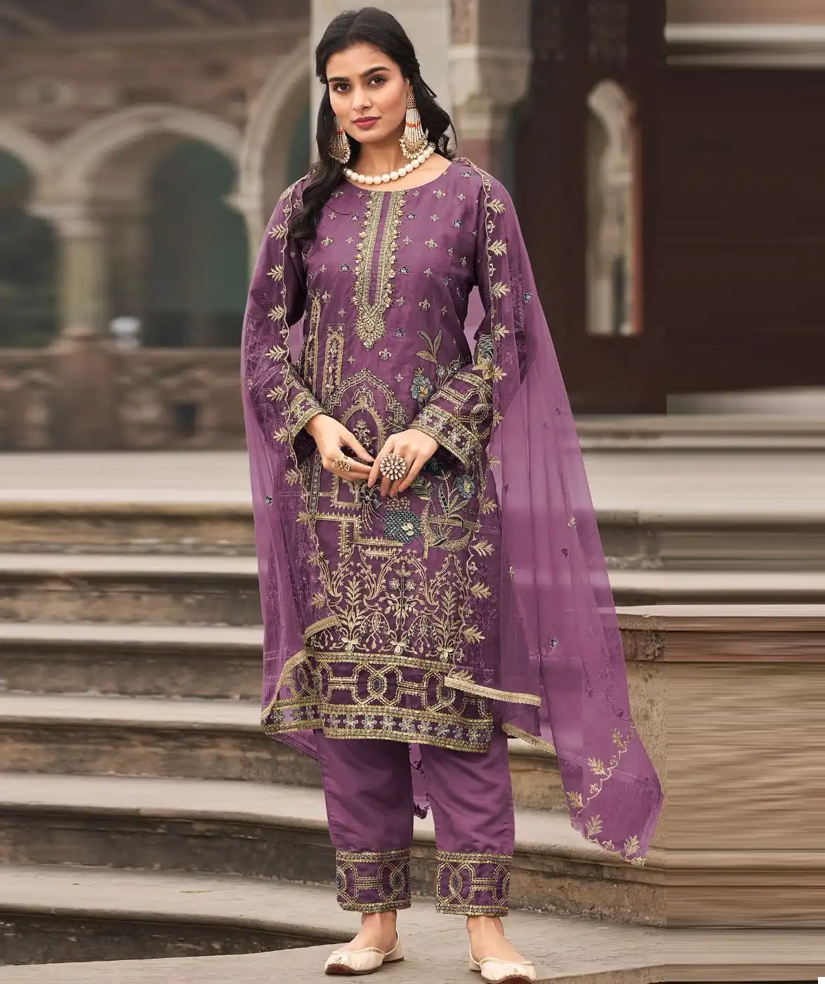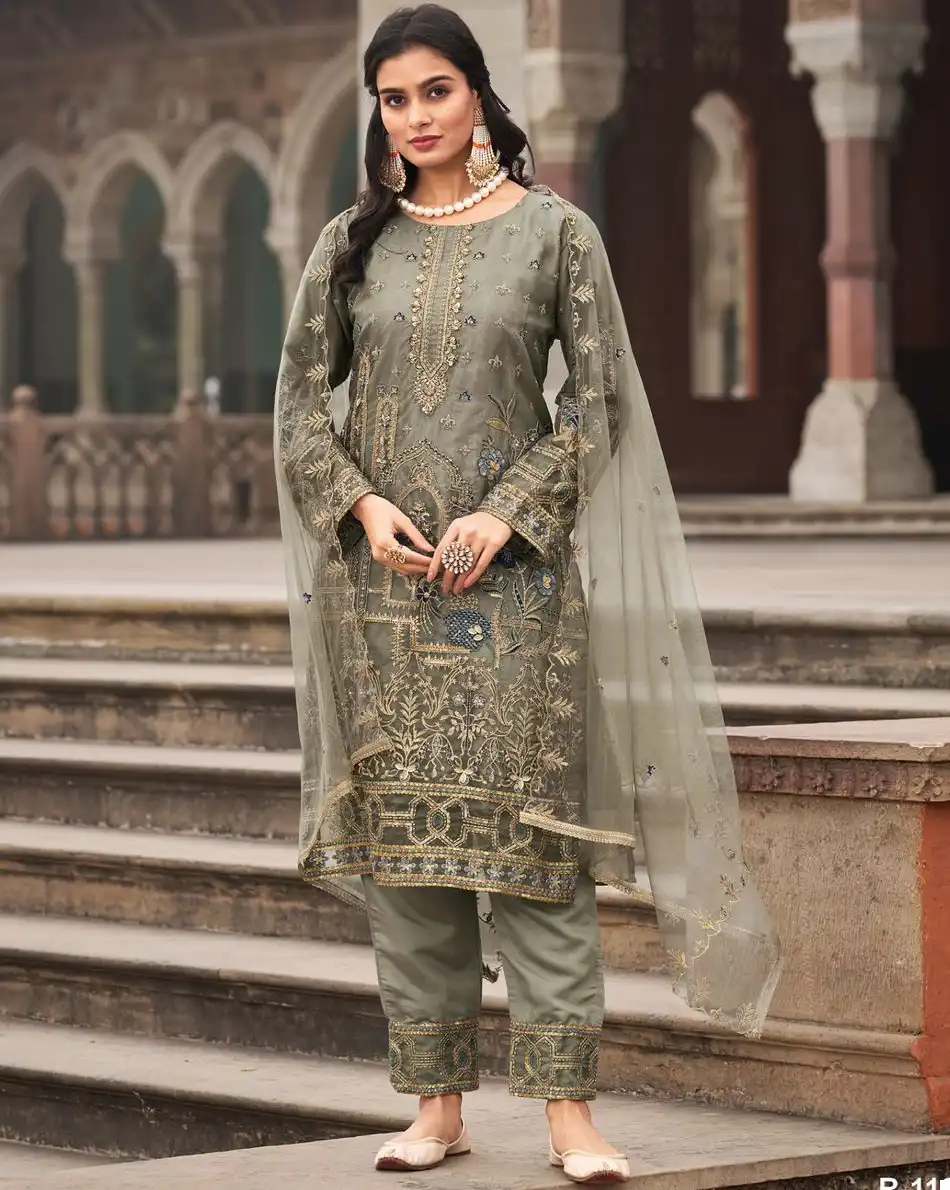 Available for pick and choose, our Organza Embroidery Sabad Khatli Work Suit Set offers flexibility in selecting your preferred color and size combination to suit your personal style and preferences.