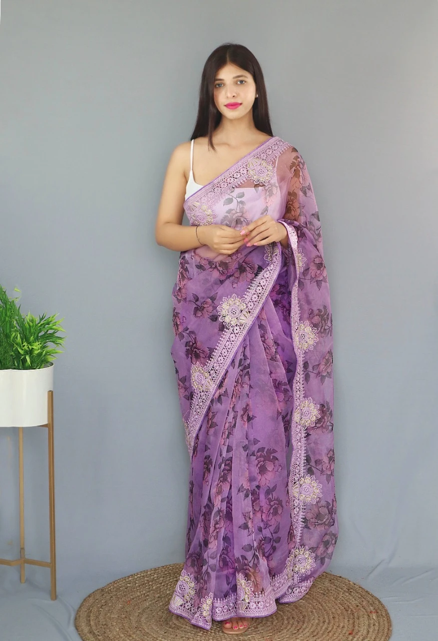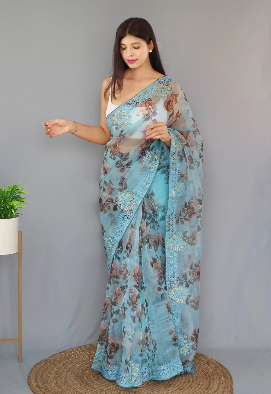This elegant saree combines intricate embroidery work with modern digital prints, paired with a fancy blouse, making it a perfect choice for festive occasions, weddings, and special events. The fusion of traditional and contemporary designs ensures a stylish and sophisticated appearance.