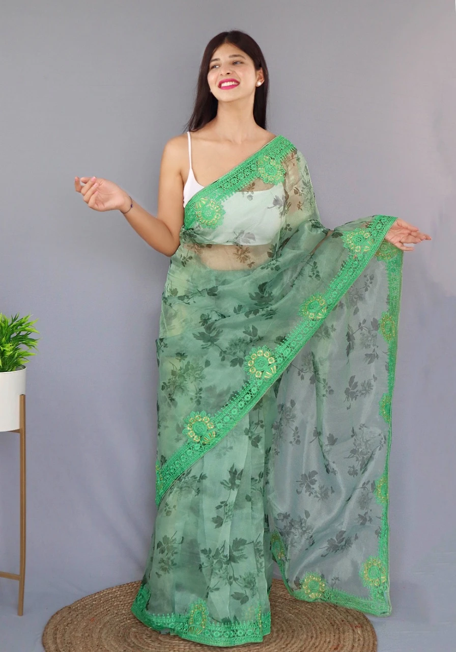 - High-Quality Fabric: Combination of embroidered and digitally printed fabric for the saree, and fancy fabric for the blouse.