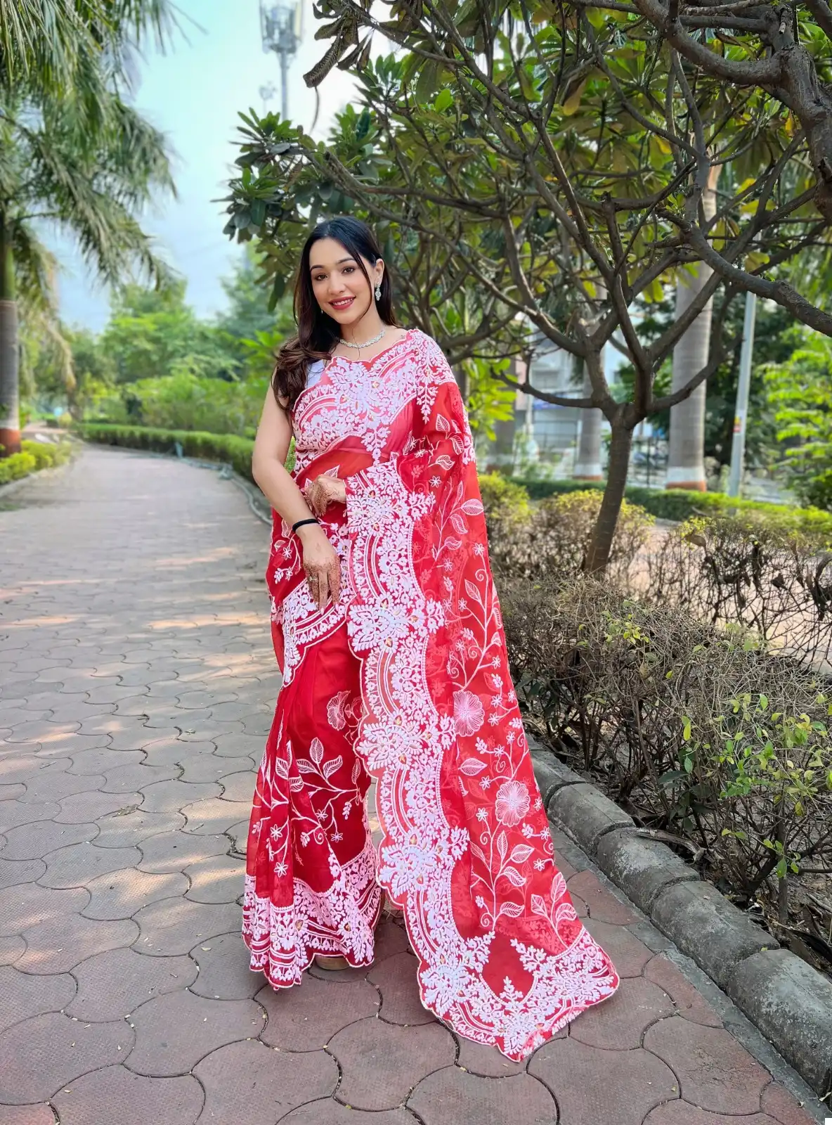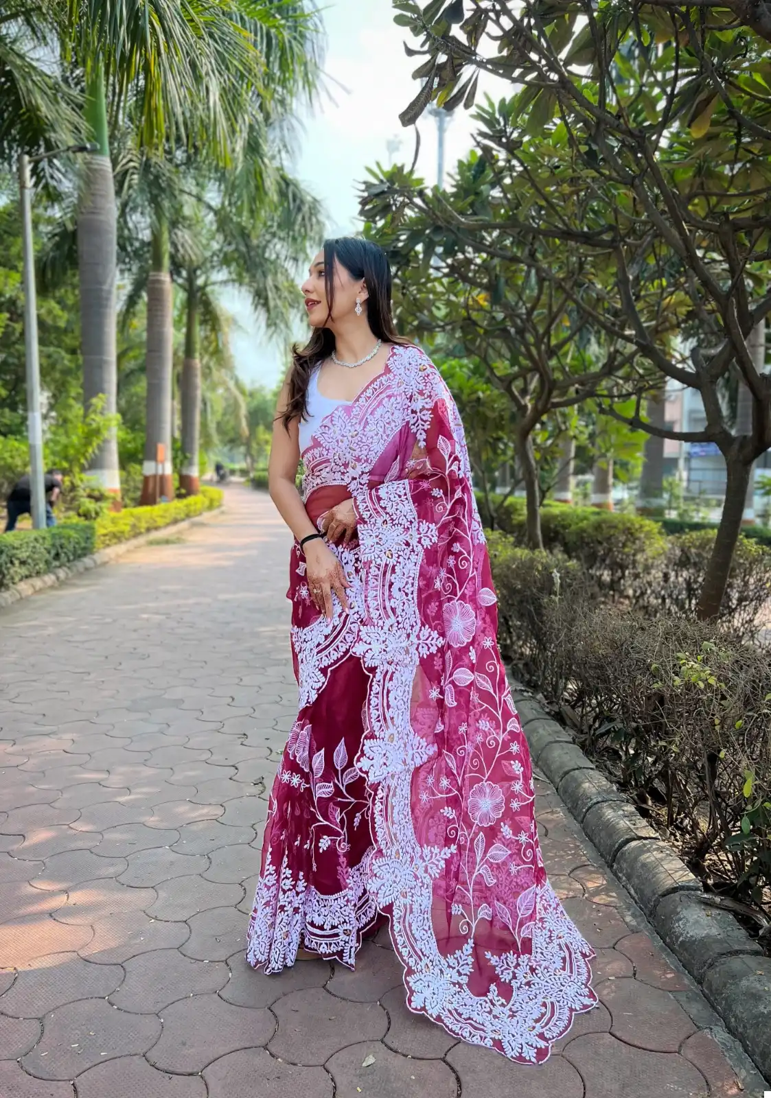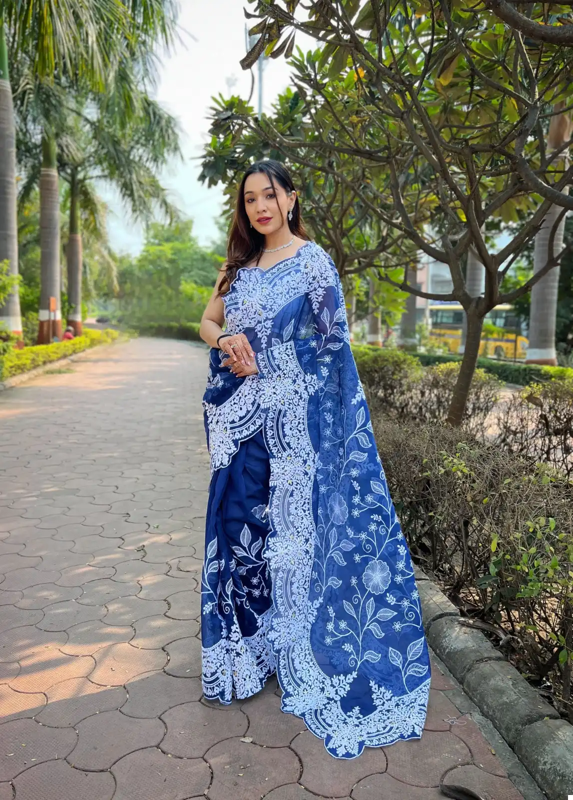 - Saree: Made of organza, which is a lightweight, sheer fabric, often made of silk. It features thread embroidery with a cut work border, which is a decorative edge made by cutting and embroidering the fabric to create intricate patterns.