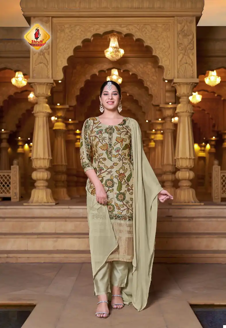 - Fabric Composition and Quality: Each suit features a top made from pure Viscose Gajji Silk, renowned for its luxurious feel and exceptional drape. The digital print on the silk adds a contemporary edge to the traditional fabric, making it a standout piece. The bottom is tailored from soft, high-quality Heavy Silk, ensuring both comfort and longevity. The ensemble is completed with a pure Chiffon Dupatta, adorned with handwork lace that elevates the overall aesthetic.