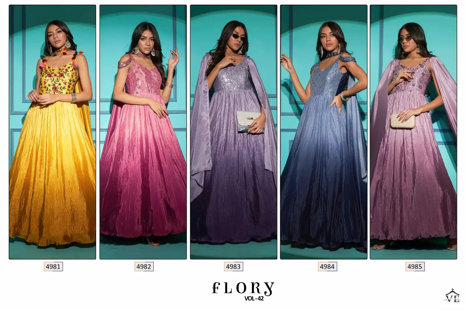 Shubhkala Flory Vol 42 Fancy Wholesale Long Gown Catalog of 5 Pcs. We deal in Kurtis, Sarees, Dresses Materials, Leggings, and Designer Salwar Kameez.