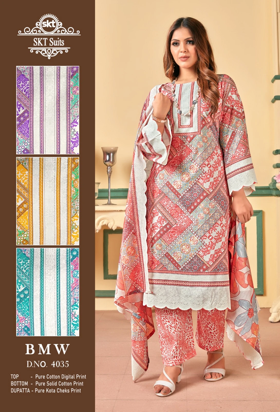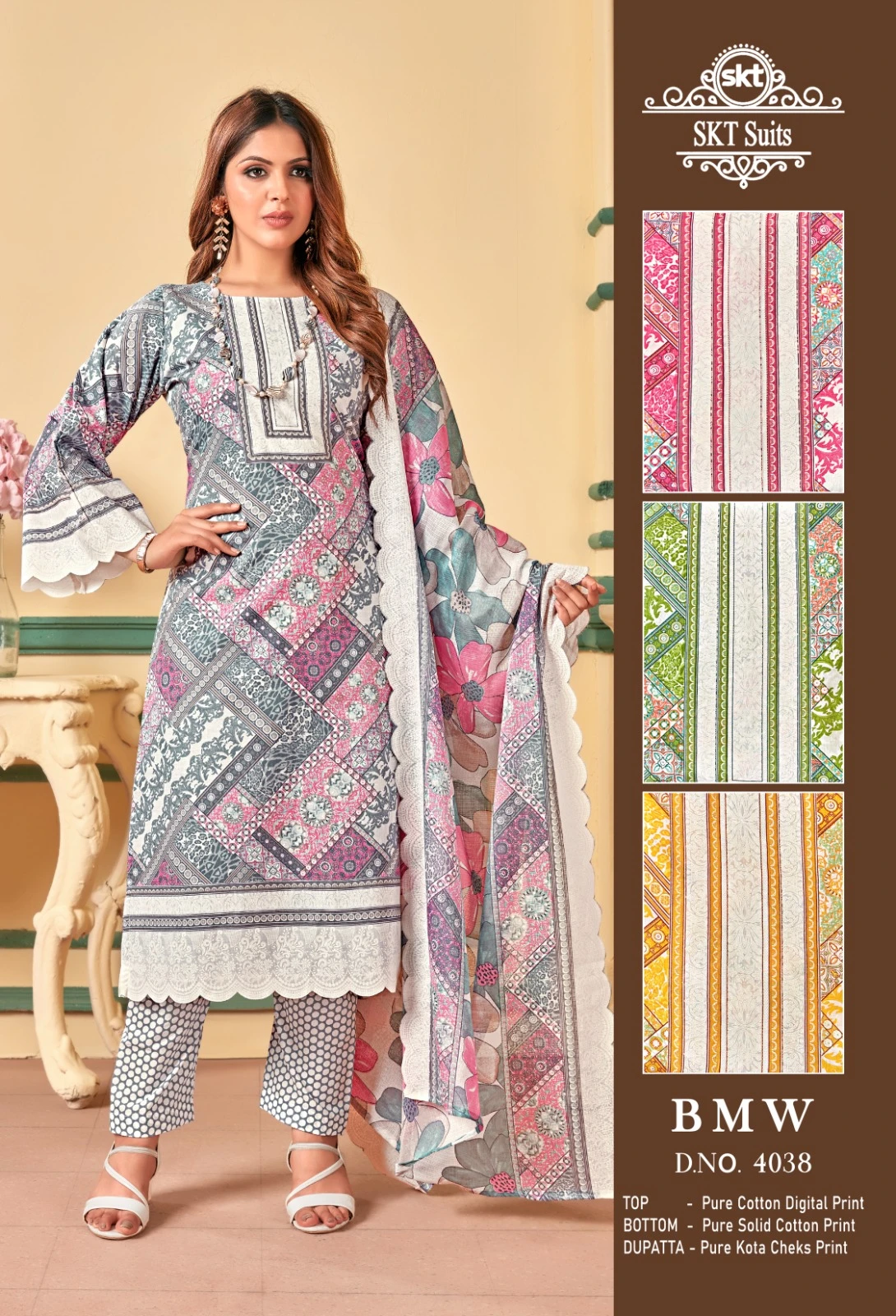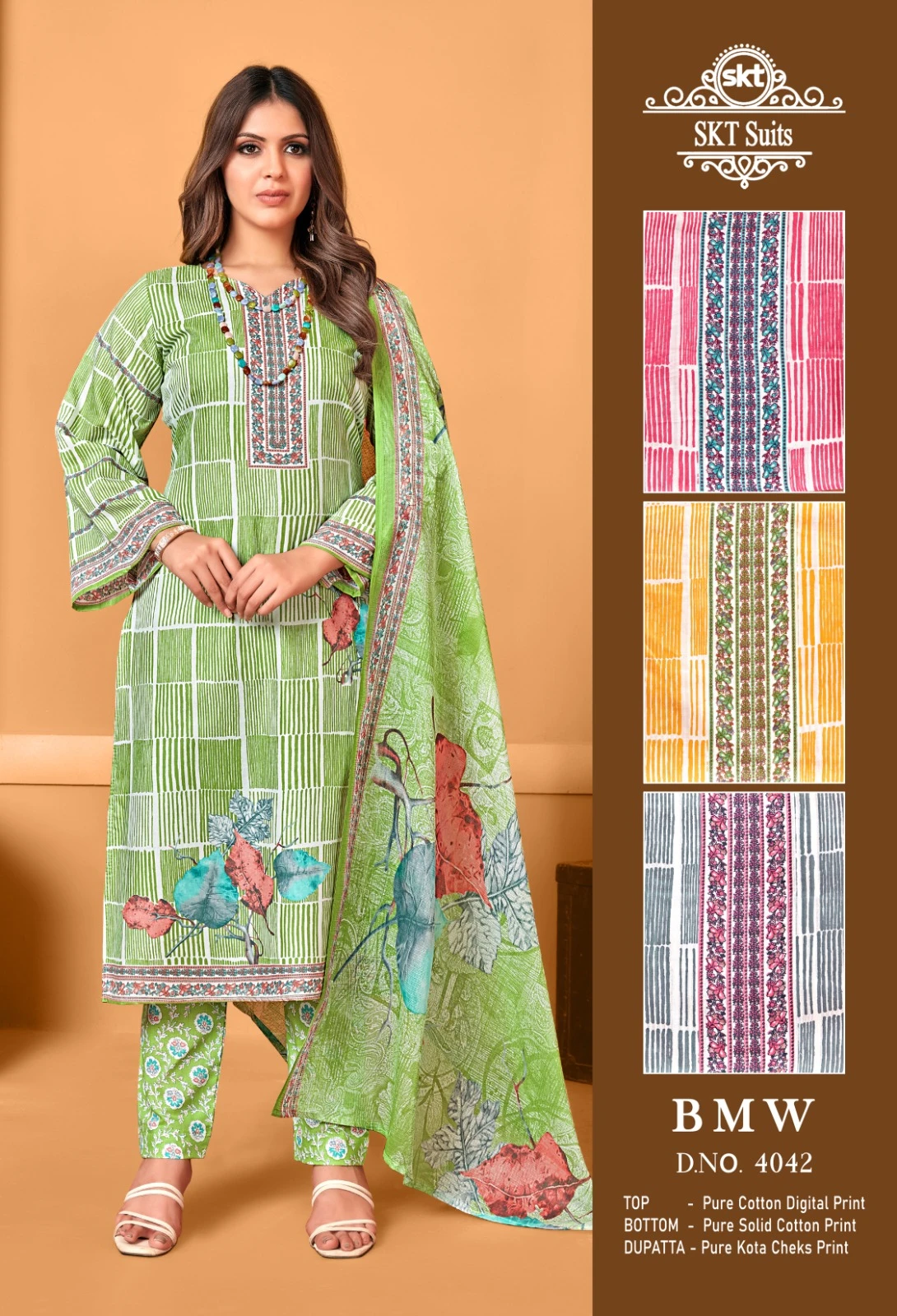This set, priced at ₹385 per piece, includes a pure cotton top and bottom, both measuring 2.50 meters, and a Kota checks digital print dupatta measuring 2.25 meters. The complete set of 4 pieces is ideal for casual wear, summer days, and festive gatherings, offering comfort, style, and ample fabric for a tailored fit.