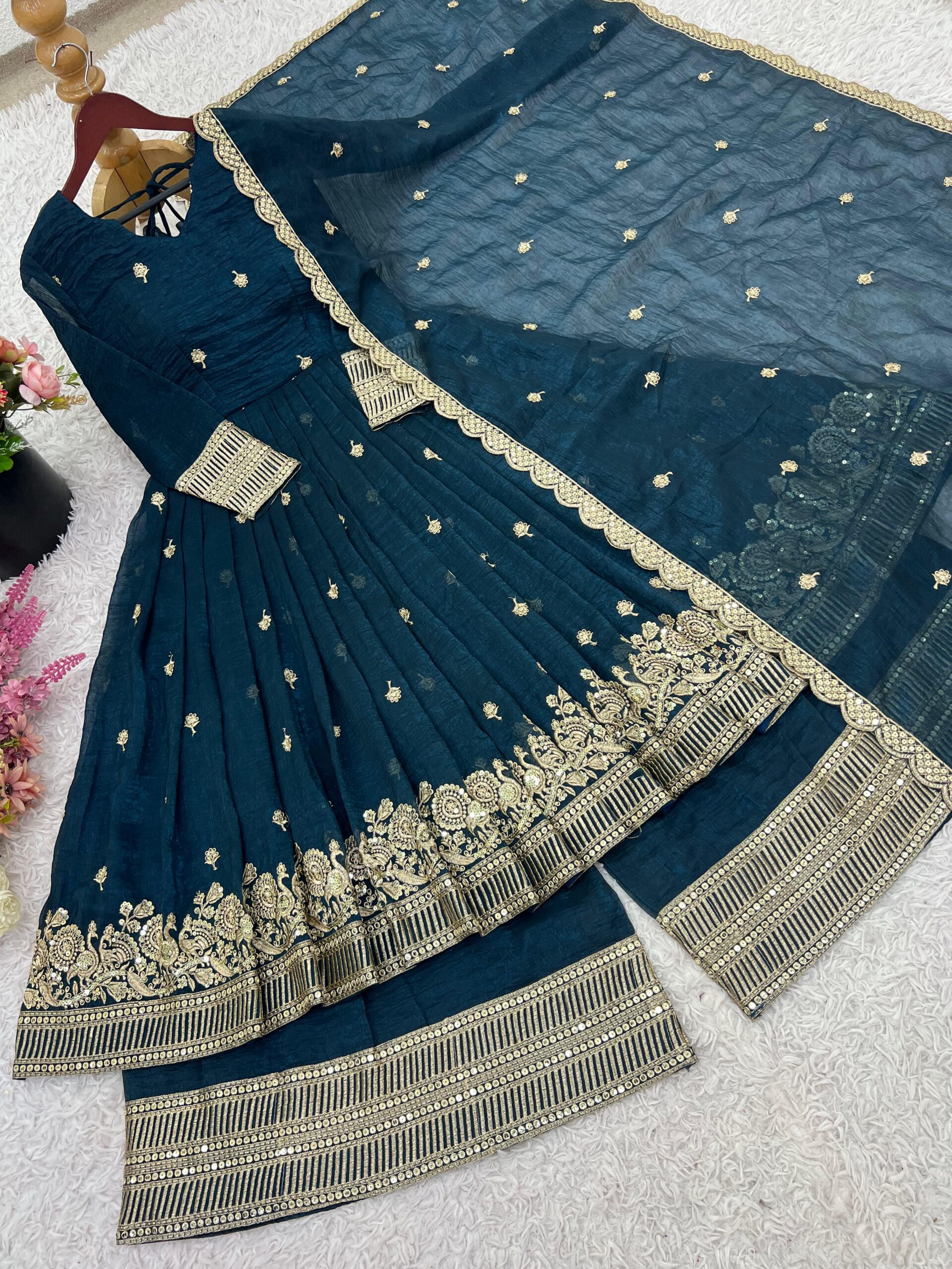 • Fabric: Heavy Crunchy Silk with Heavy Embroidery & Sequence Work, Fully Flared