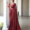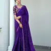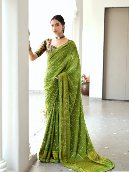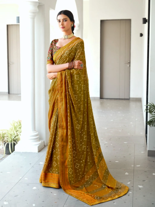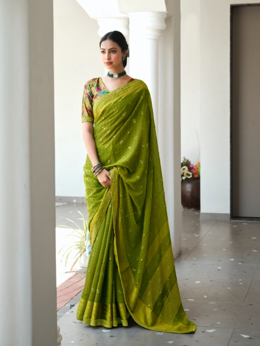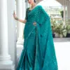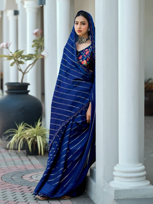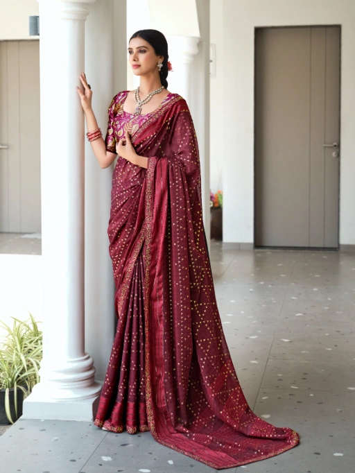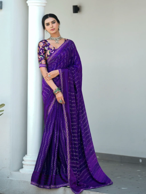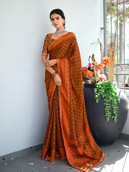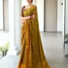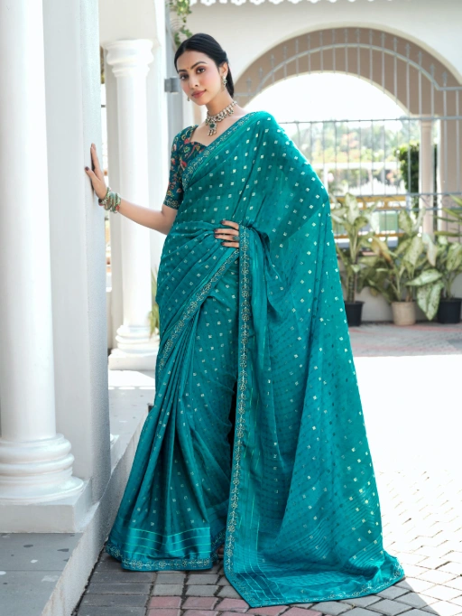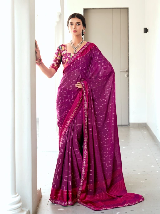 Elegant sarees featuring intricate self-weaving texture, finely embroidered borders, and a modern contrast digital blouse for a complete designer look.