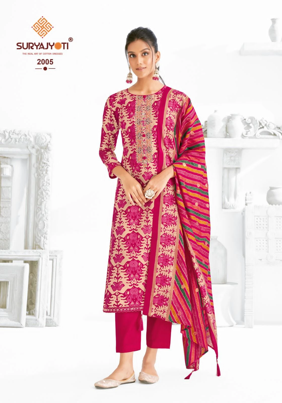 Product Description: Elevate your ethnic wardrobe with our Set of 6 Pure Modal Salwar Suits, crafted for comfort and elegance. Each suit features a top made from pure modal fabric, adorned with a stylish discharge print and enhanced with foil detailing, complemented by delicate neck embroidery, spanning approximately 2.50 meters for a graceful drape. The bottoms are crafted from pure modal dyed fabric, providing a comfortable fit with approximately 2.50 meters of fabric. Adding to the ensemble is a pure modal discharge foil print dupatta, measuring approximately 2.25 meters, adorned with charming tassels for a touch of sophistication. Available as a set of 6, this collection offers versatility and style, perfect for everyday wear or special occasions. Embrace the elegance of modal fabric with intricate prints and embroidery, designed to enhance your wardrobe with timeless beauty and contemporary flair.