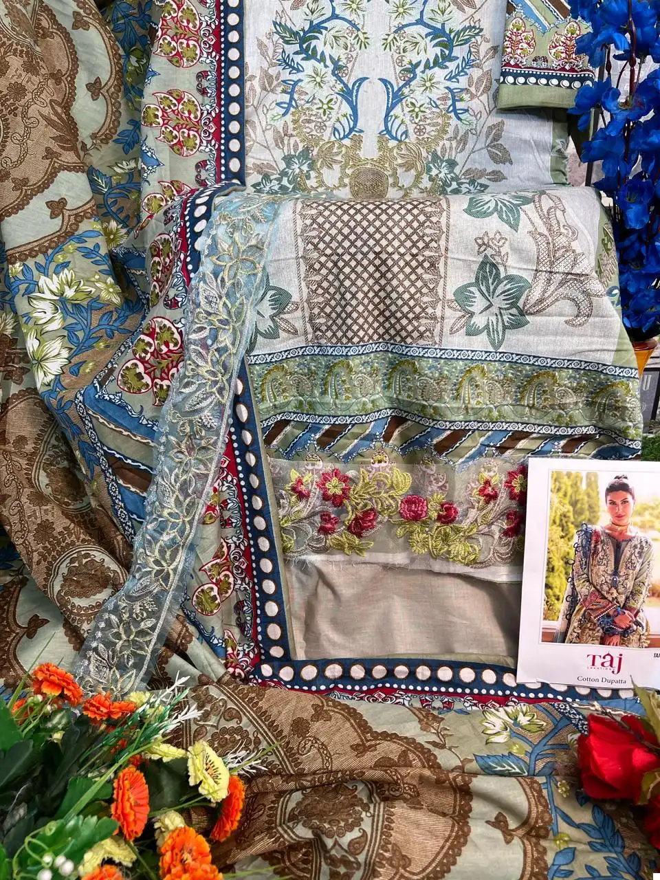 - Exquisite Pure Cotton Tops: Adorned with vibrant prints and enhanced with heavy embroidery featuring 2 elegant patches, these tops epitomize craftsmanship and design prowess.