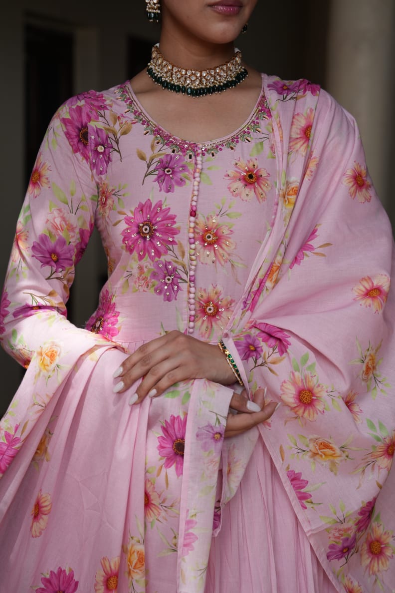Top: Cotton with Work and Handwork Touchup – Full Anarkali Flair