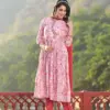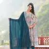 - Work: The ensemble boasts a stunning combination of digital print and handwork in the neckline, adding a unique and eye-catching element to the outfit. The intricate detailing enhances the overall appeal of the ensemble, making it perfect for special occasions and events where you want to make a statement.
