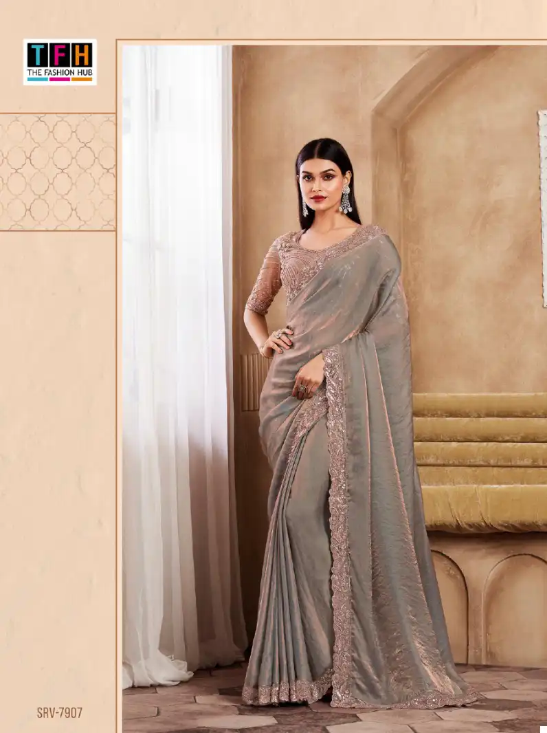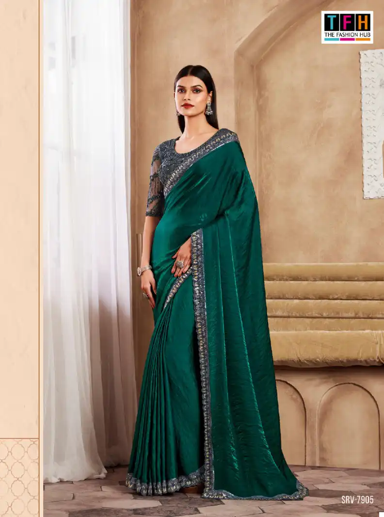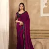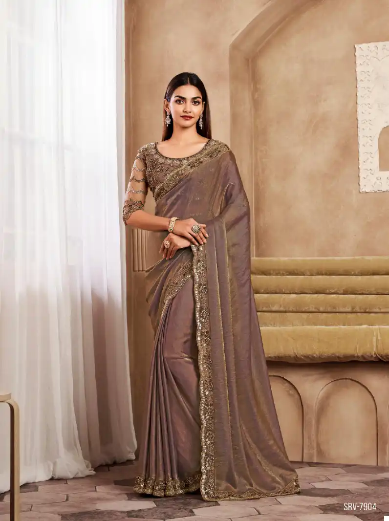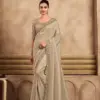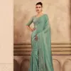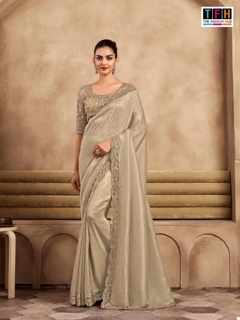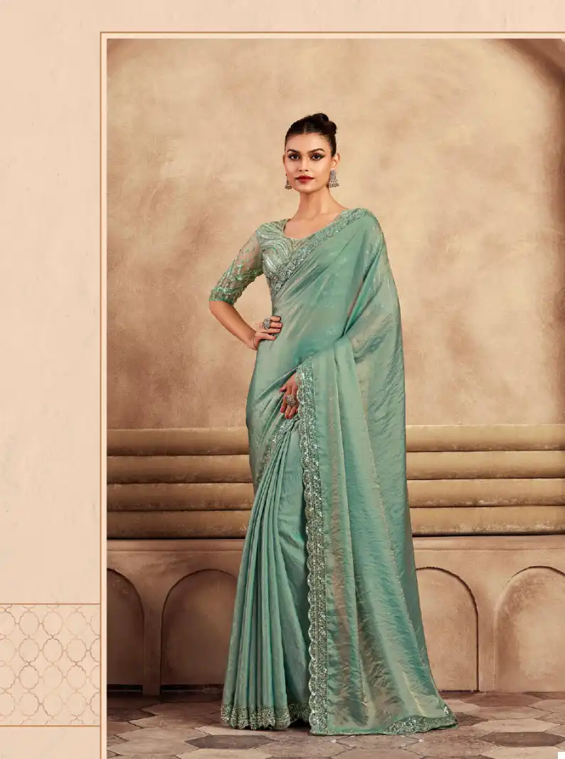 - The saree is crafted from a combination of Soft Touch Satin Silk, Glass Feel Chiffon Silk, Imported Soft Silk, and features a Gold Flake Silk Hand Work Border, adding a touch of elegance and luxury to the design.