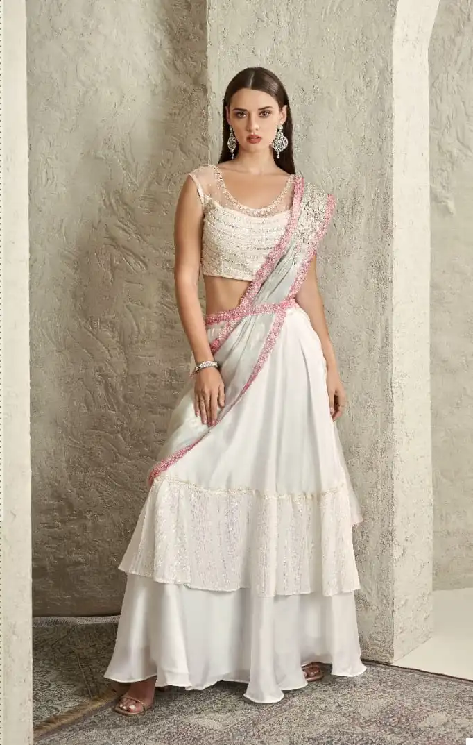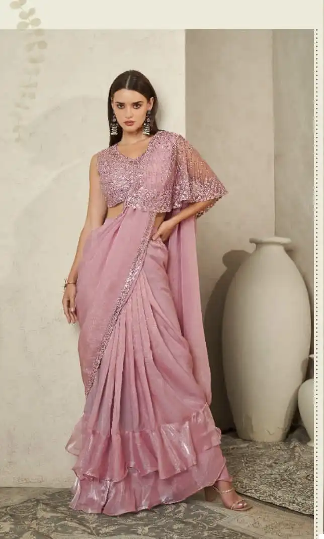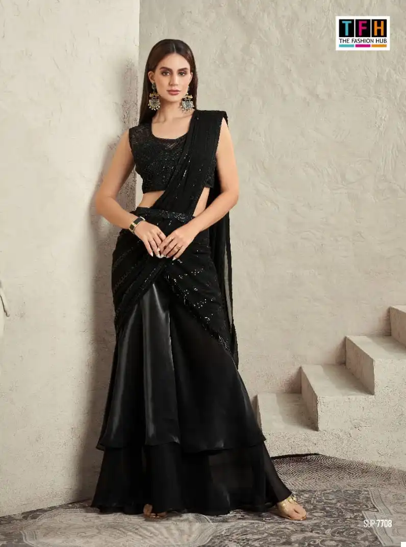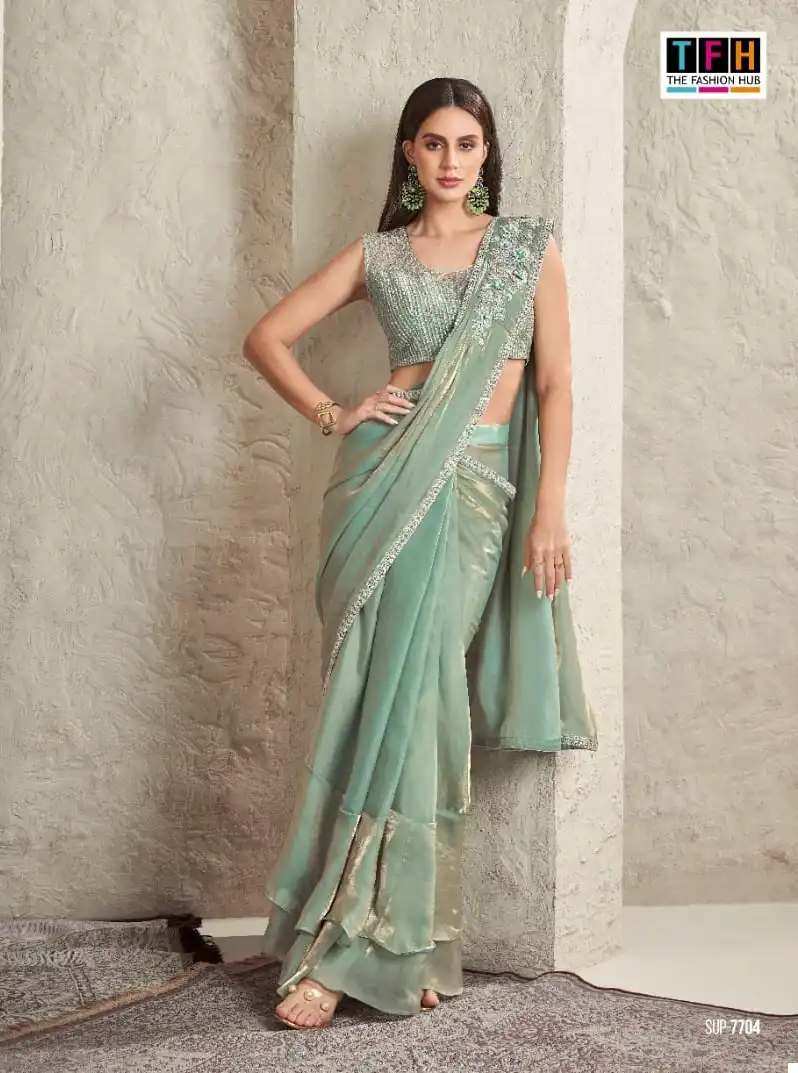 This saree is perfect for various occasions, including weddings, parties, and festive gatherings. Its blend of fabrics and attention to detail make it a unique and eye-catching choice. Whether you want to make a statement at a special event or simply enjoy the pleasure of wearing a beautifully crafted saree, this option offers both versatility and elegance.