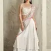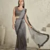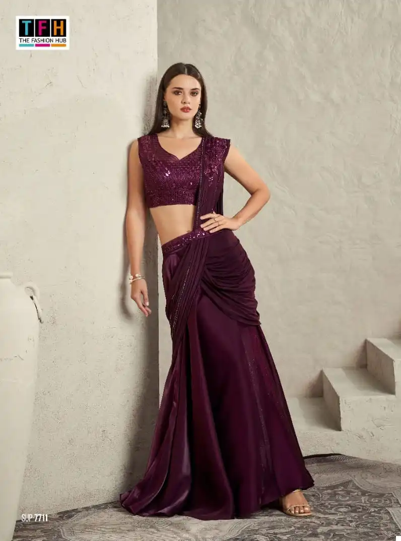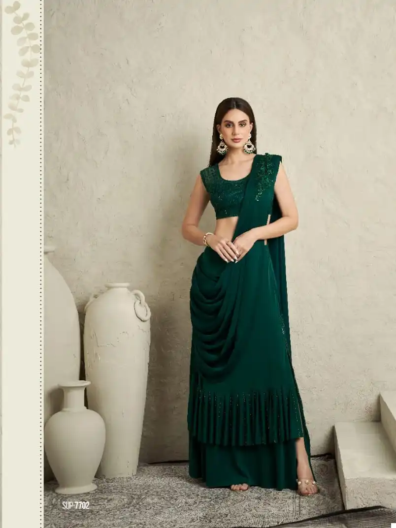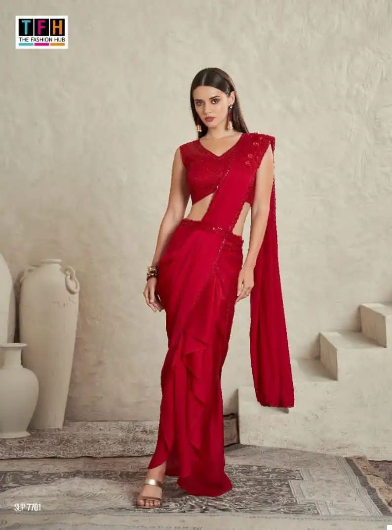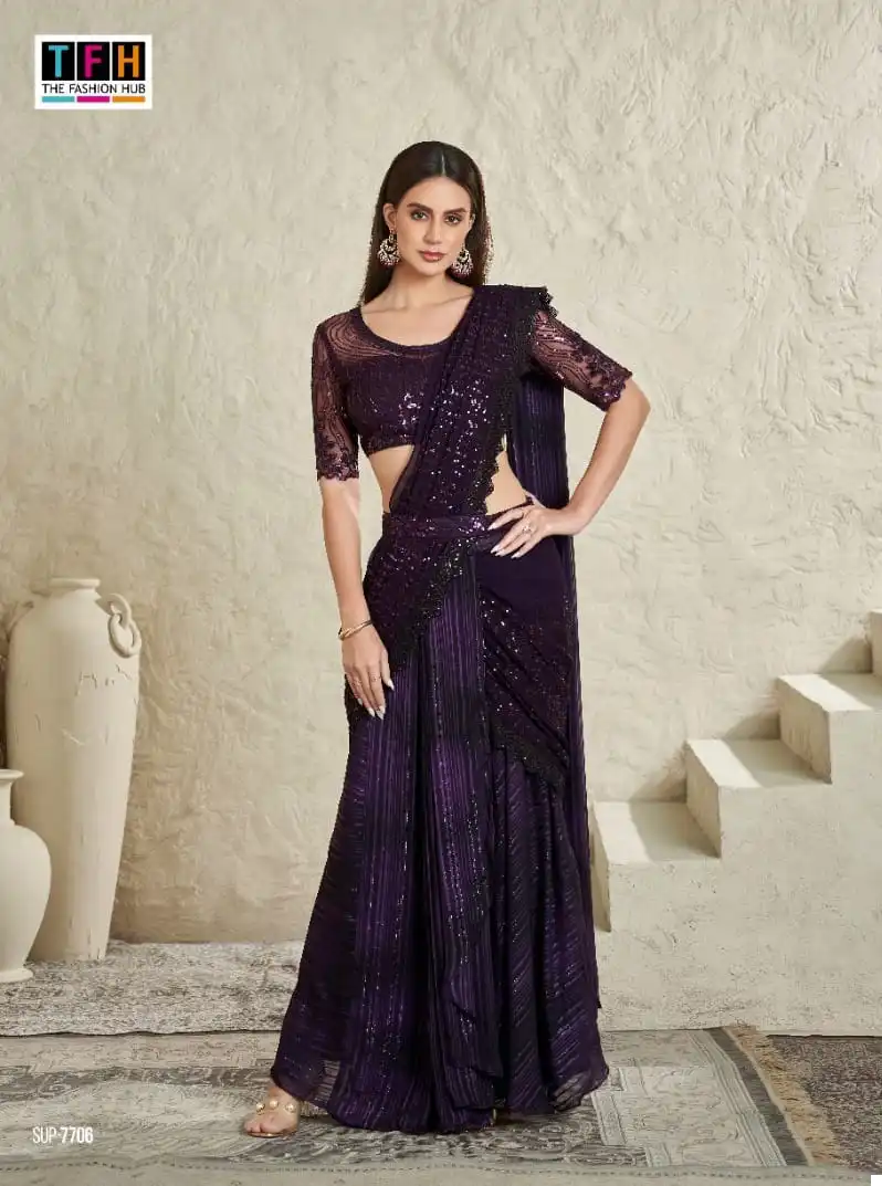 This saree is perfect for various occasions, including weddings, parties, and festive gatherings. Its blend of fabrics and attention to detail make it a unique and eye-catching choice. Whether you want to make a statement at a special event or simply enjoy the pleasure of wearing a beautifully crafted saree, this option offers both versatility and elegance.
