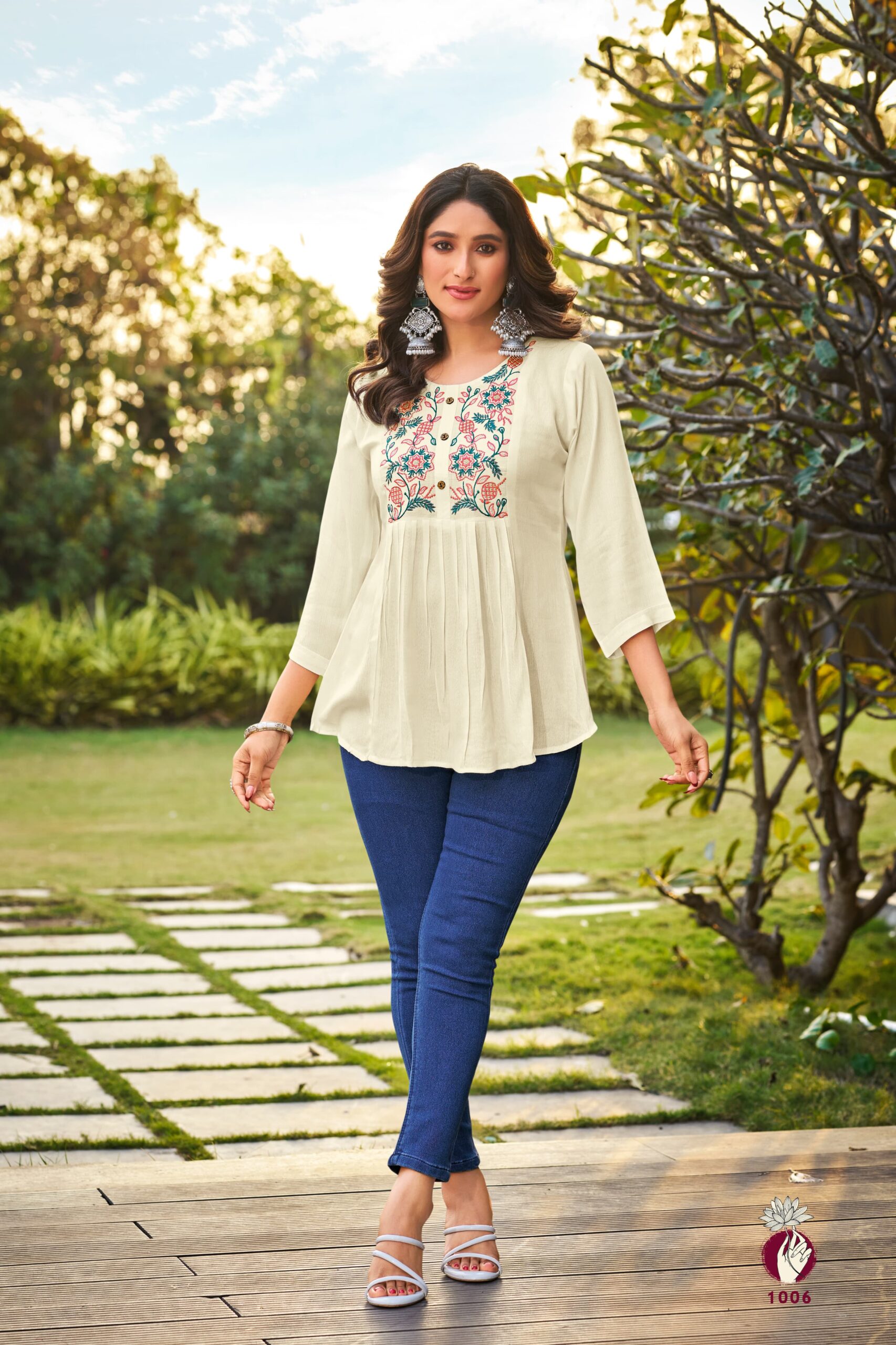 Introducing the *Sana Vol 04 Fancy Short Tops Collection* by *Tips & Tops*, designed for those who love to combine comfort with style. These trendy short tops are crafted from high-quality *Rayon Wrinkle fabric*, offering both durability and a soft touch. Highlighted with *heavy embroidery* and designed with fashionable *3/4th sleeves**, these tops are perfect for casual outings, office wear, or small gatherings. With a length range of *28 to 30 inches*, these tops offer a flattering fit for women of all body types.