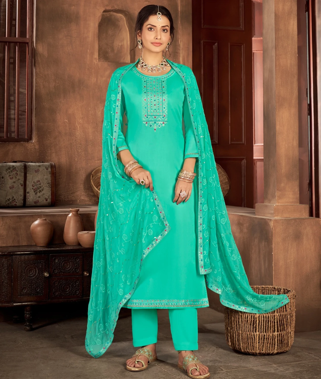 This pure Jam silk cotton salwar suit set with a rayon bottom and semi pure dupatta is a versatile and stylish choice for various occasions. Its combination of high-quality fabric and detailed design ensures you look elegant and feel comfortable.
