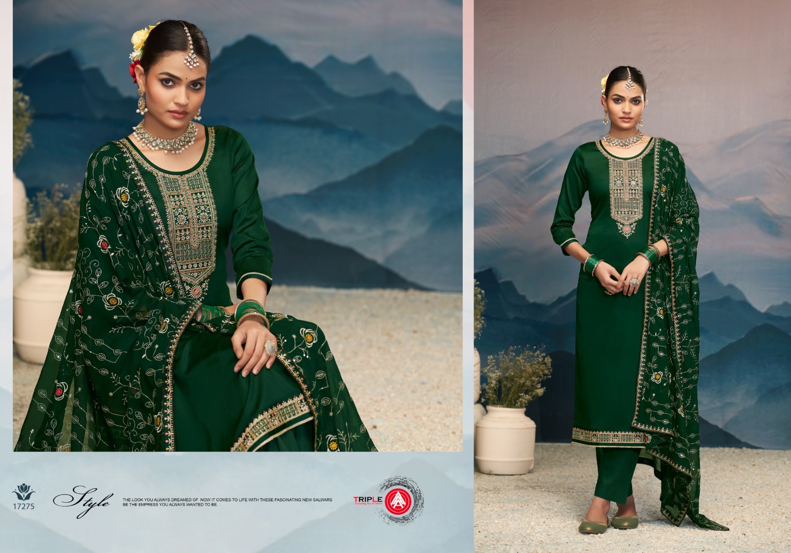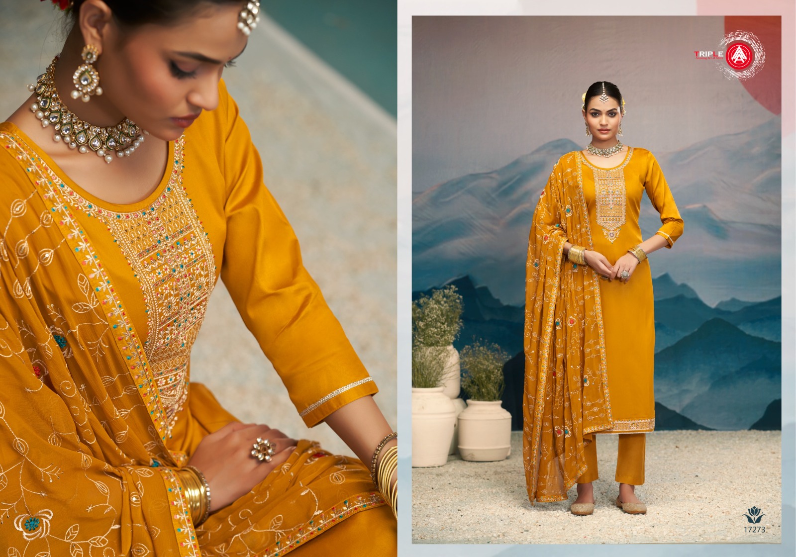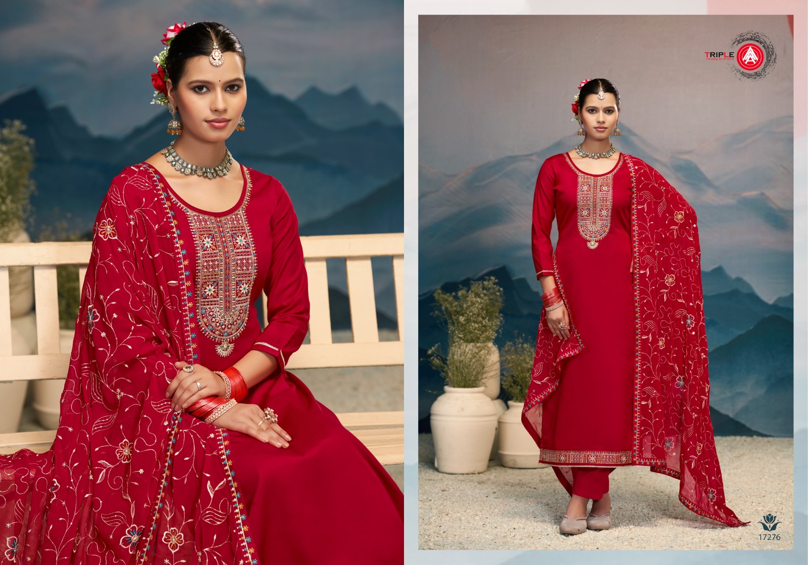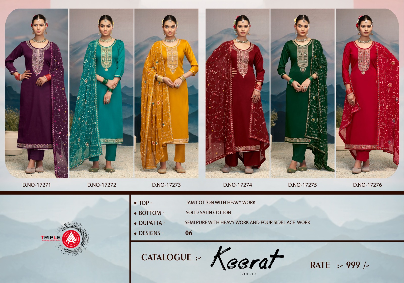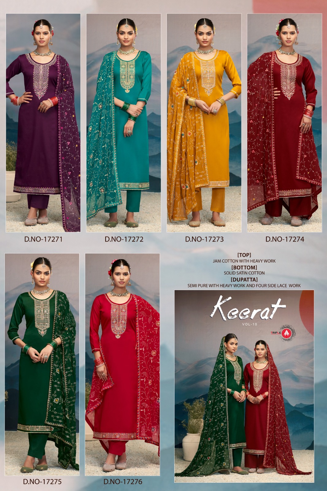 Buy TRIPLE Keerat Vol-10 designer salwar suits with jam cotton top and heavily worked dupatta at wholesale price.