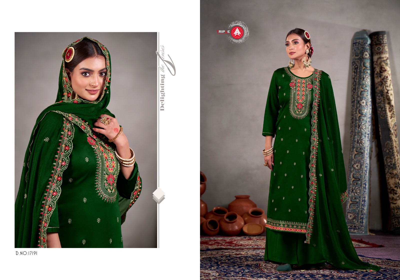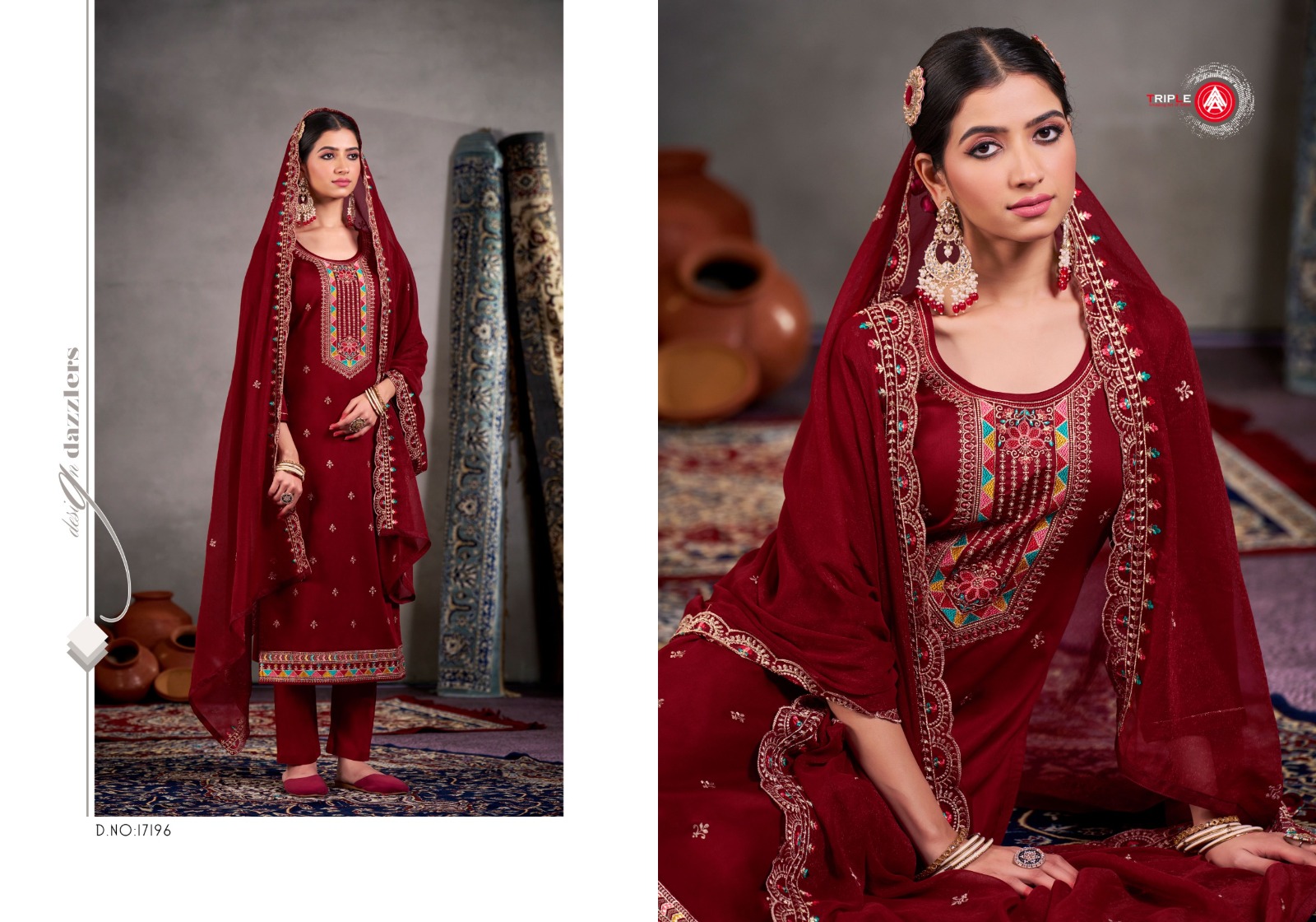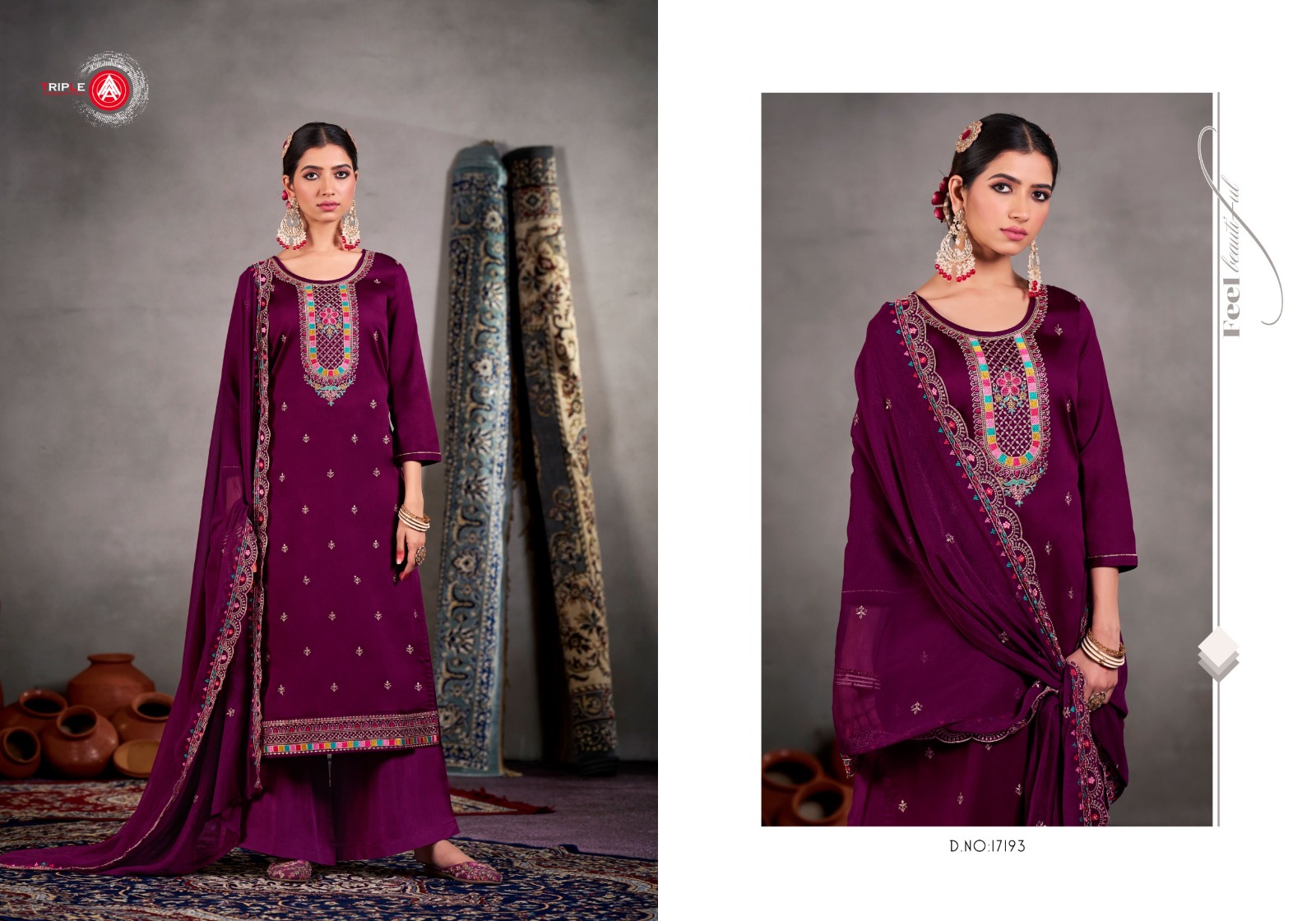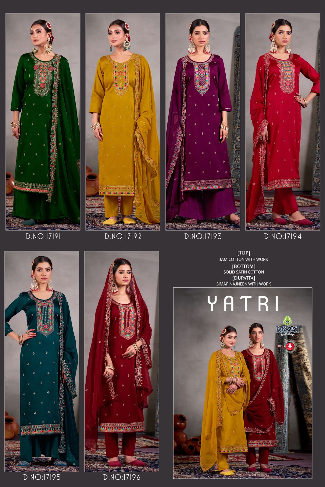 TRIPLE Yatri –Jam Cotton Embroidered Satin Salwar Suit Catalog.